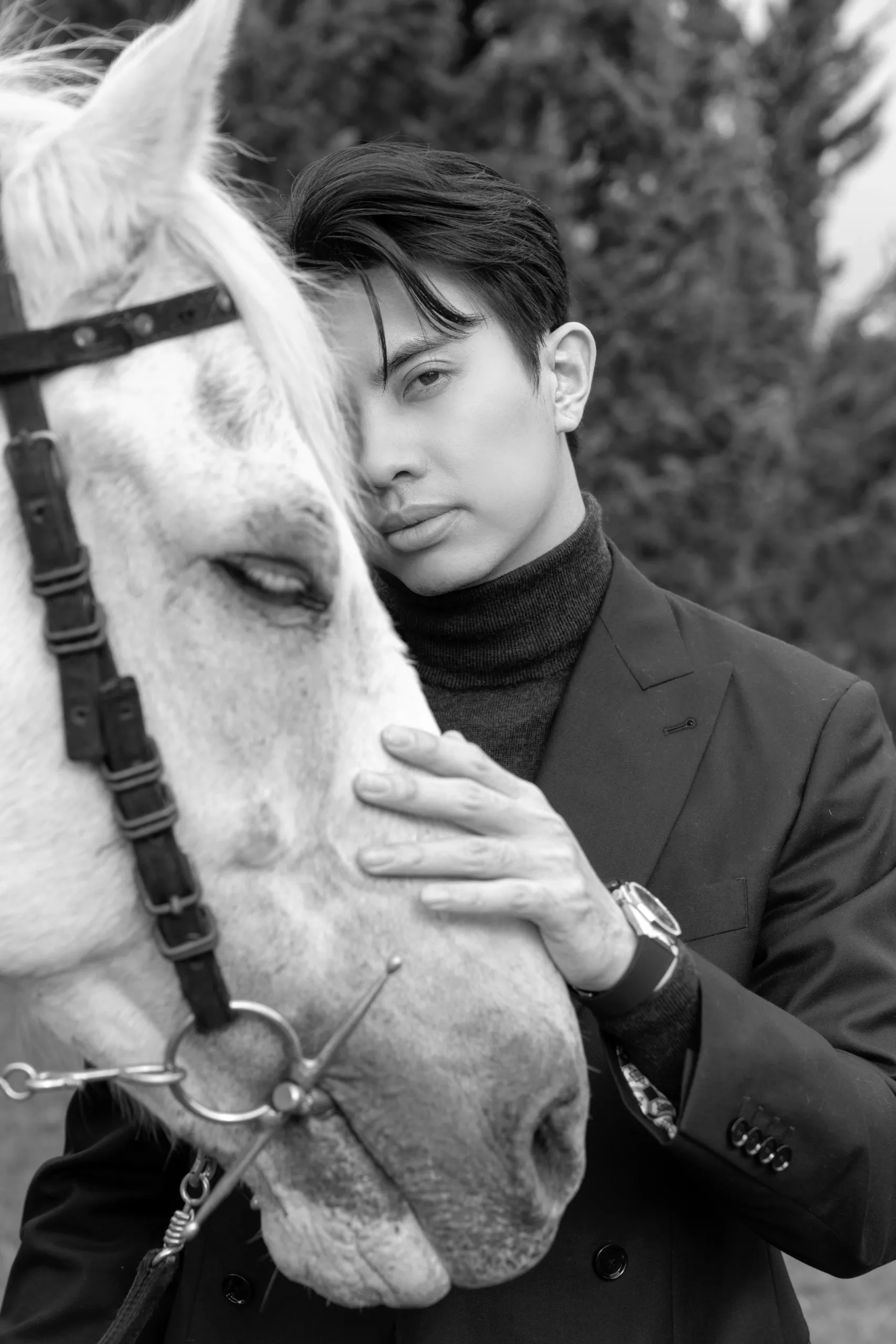Her fiancé balanced the aesthetic with classic menswear that subtly nodded to formality without fuss—starting with a double-breasted dark suit in the garden and evolving into a crisp ivory tuxedo jacket and black satin bow tie for their indoor portraits. Together, they were the picture of timeless style—elegant, composed, and deeply in sync.