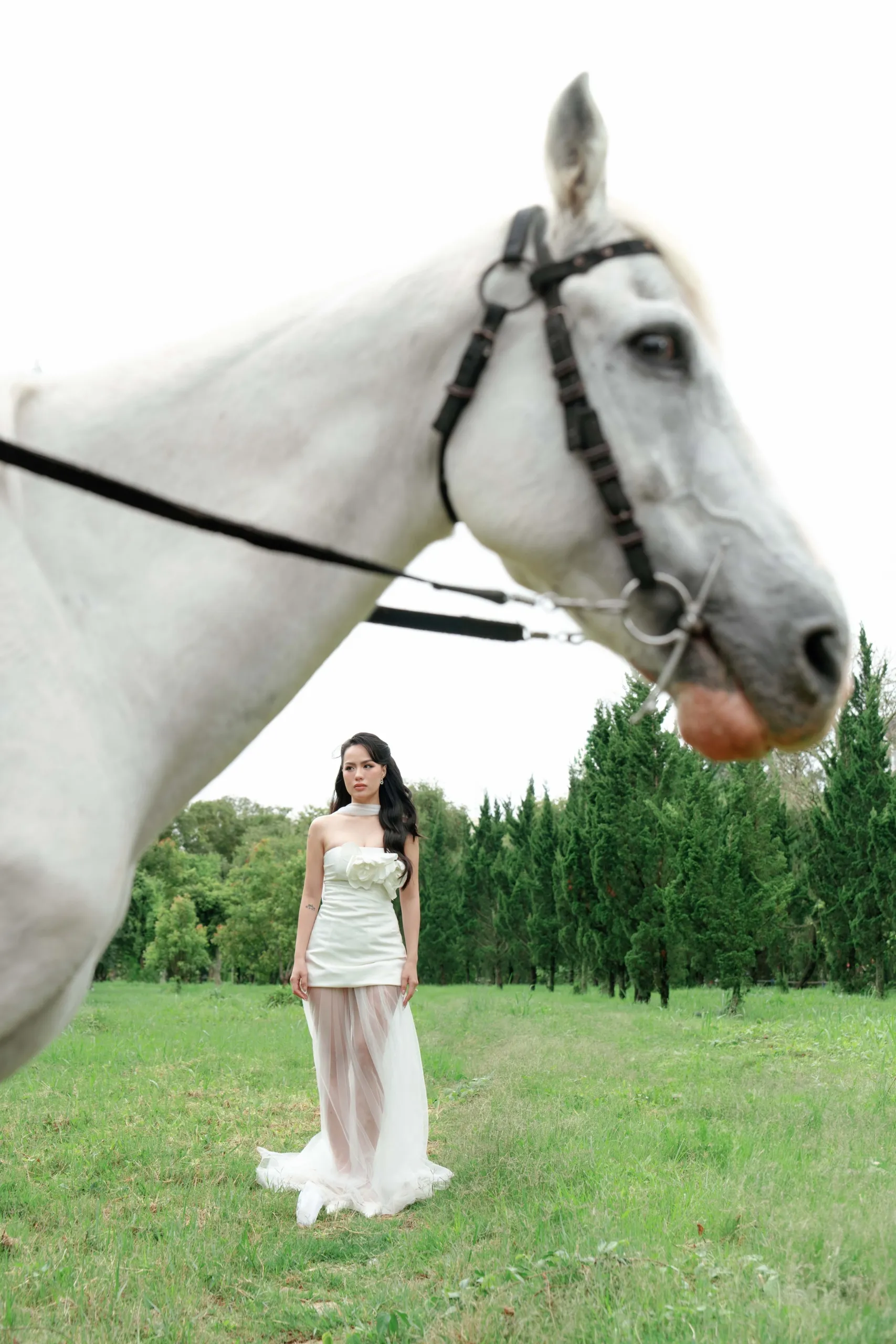 Han embodied the vision flawlessly. In one look, she wore a contemporary ivory mini dress with a flowing train and floral appliqué, striking a bold yet romantic silhouette against the garden’s pine-lined backdrop. Her bridal gown channeled a couture-inspired sensibility: a structured corset bodice, off-shoulder lace sleeves, and delicate net gloves created a cinematic portrait of femininity. Every detail, from her drop earrings to her scarlet lip, spoke to a carefully edited sense of glamour.