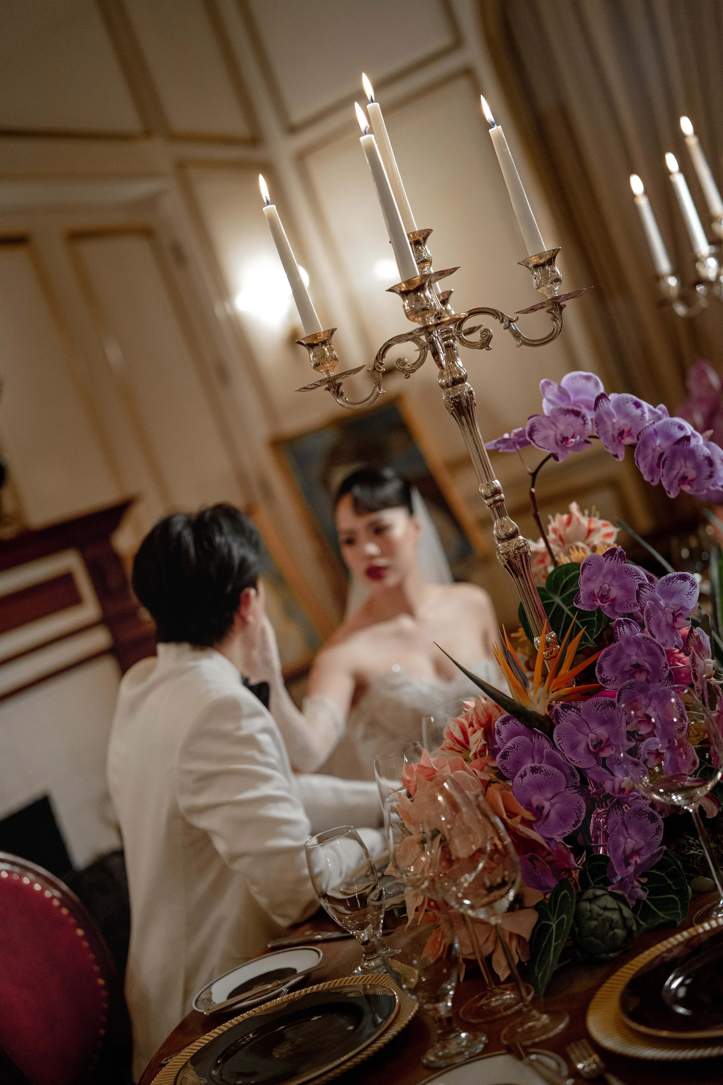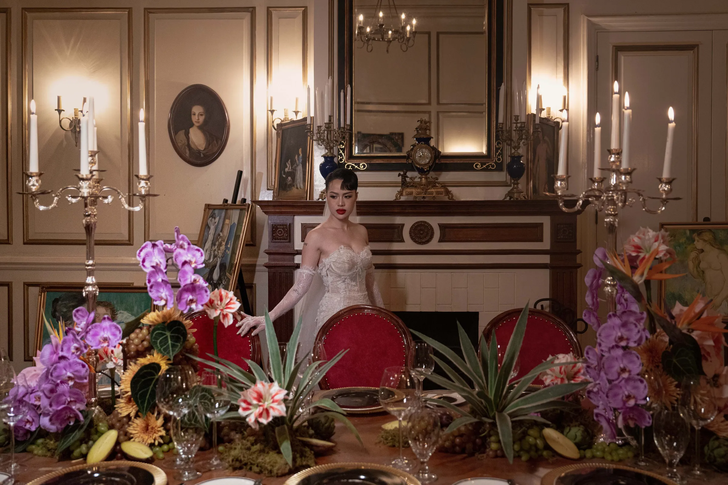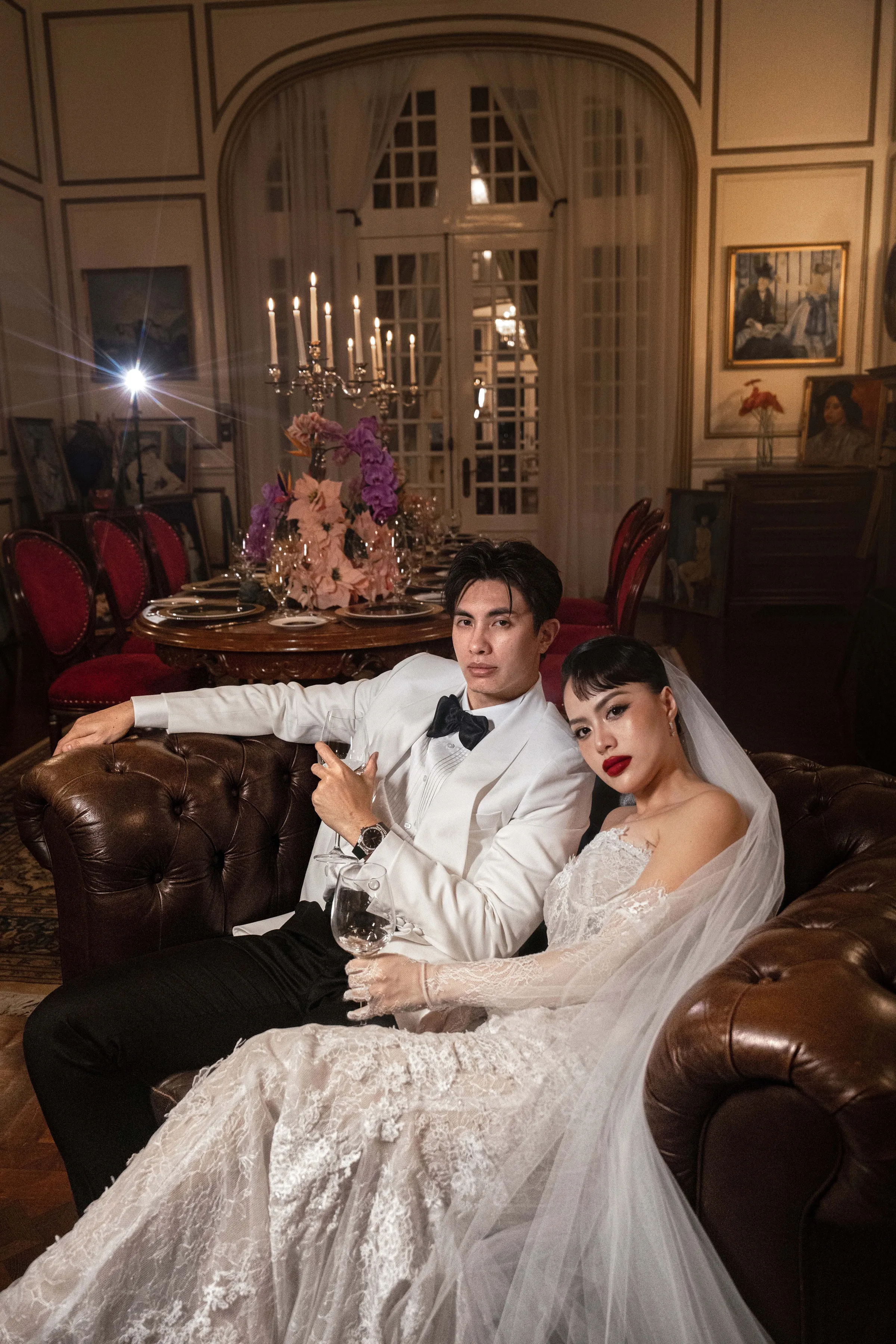 Shot entirely on-location, the editorial seamlessly blended interiors rich with antique furniture and patinaed gold frames, with moments of quiet intimacy—a bride adjusting her groom’s tie, or leaning contemplatively against carved wood. The visual tone was soft, warm, and editorial in pacing—conveying emotion not through grandeur but through stillness.