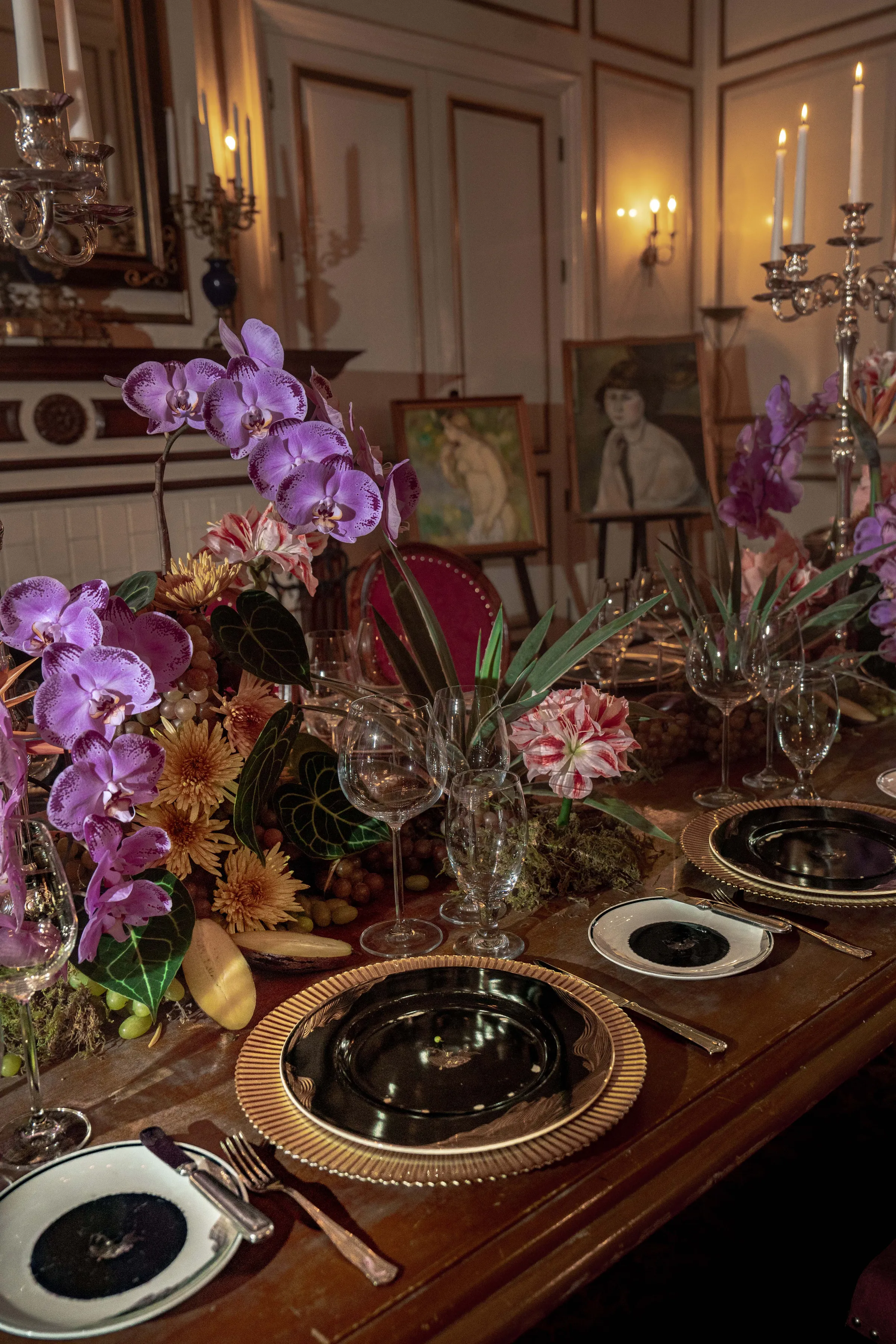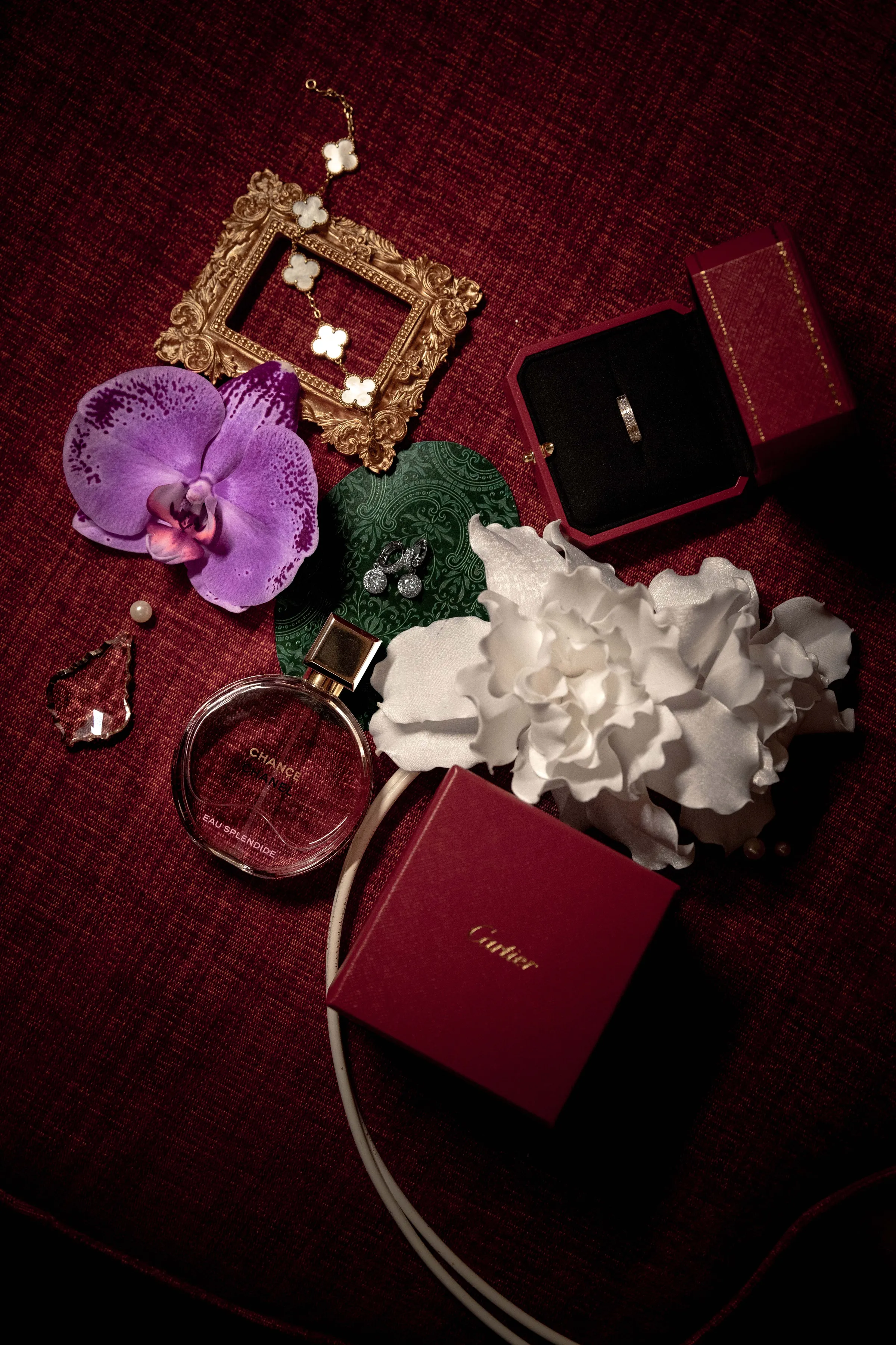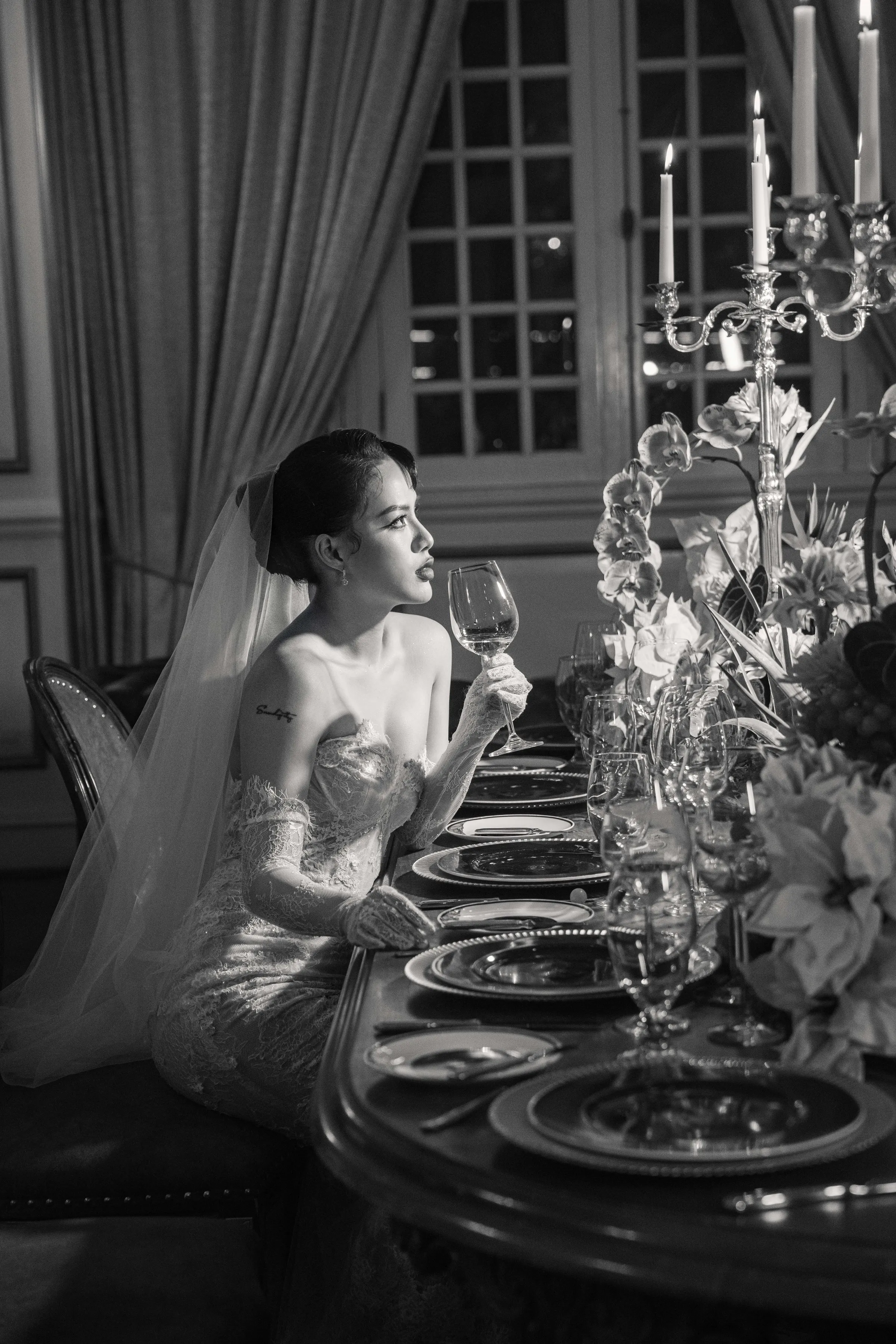 Shot entirely on-location, the editorial seamlessly blended interiors rich with antique furniture and patinaed gold frames, with moments of quiet intimacy—a bride adjusting her groom’s tie, or leaning contemplatively against carved wood. The visual tone was soft, warm, and editorial in pacing—conveying emotion not through grandeur but through stillness.