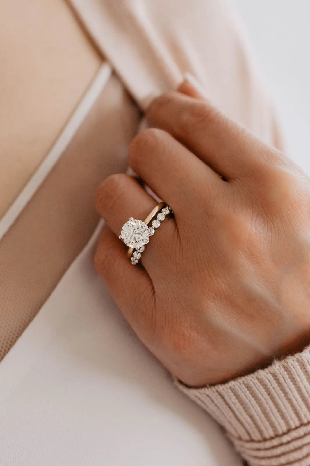 Thirdly, also take into account the width and size of each ring, which will greatly impact the proportions of your jewellery selection. If you’d like any one element to take centre stage, you might prefer to have the others be relatively unassuming. For example, a simple, plain, wedding band would draw further attention to the scintillating diamond on your engagement ring. Alternatively, have all elements merge seamlessly by choosing rings of similar proportions. A large round diamond would proportionately stand out less when framed by a wide pavé ring, for example.