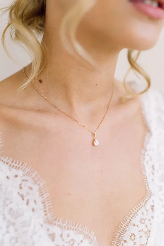 The Dainty Pendant: Ideal for sweetheart or V-neck dresses, a delicate pendant necklace adds a touch of simplicity and charm. A single diamond on a thin chain is the epitome of elegance and works wonderfully with just about any dress style.