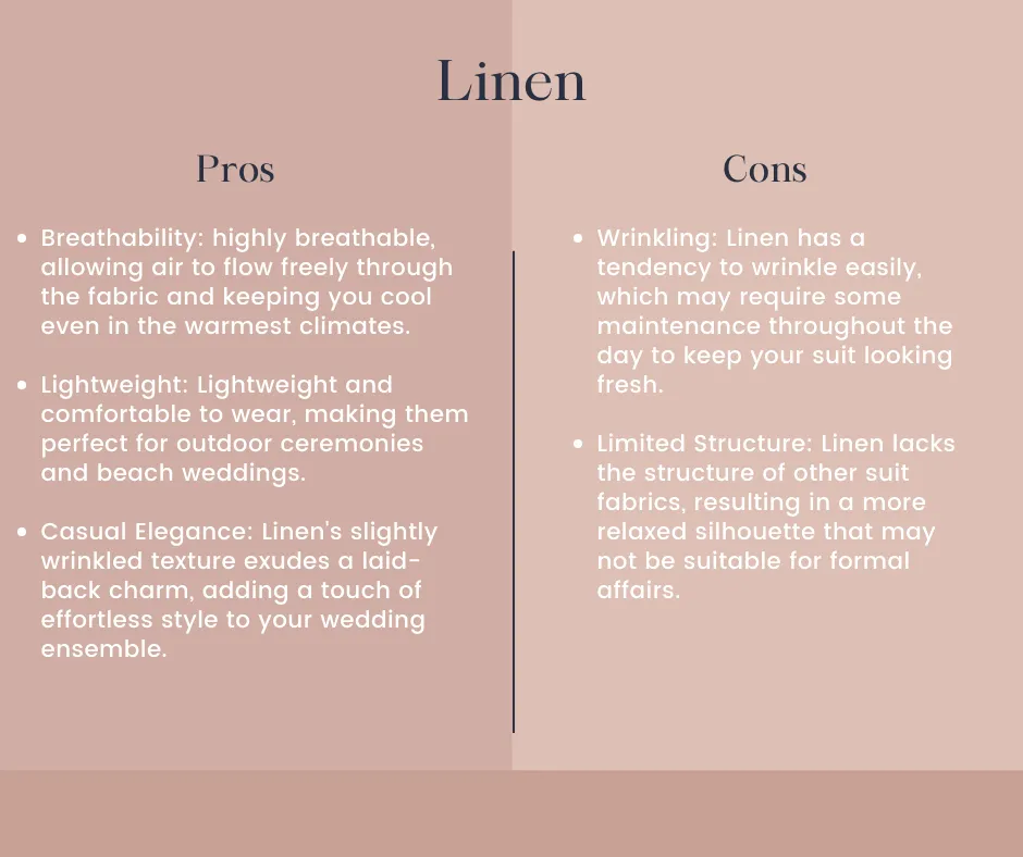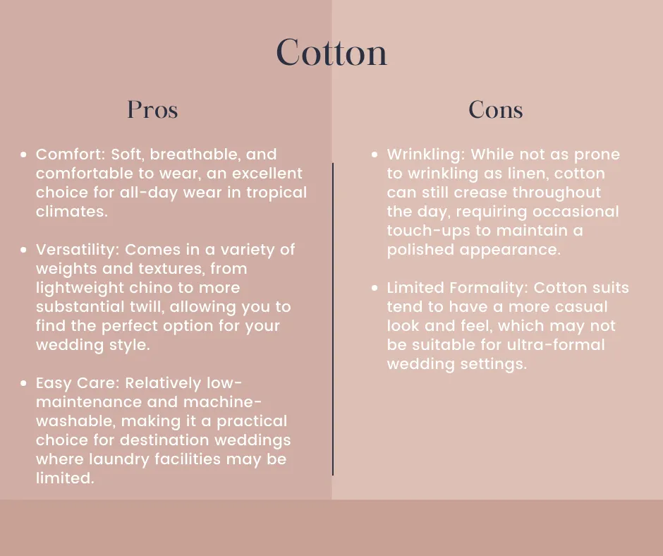 Linen is a classic choice for tropical weddings, prized for its natural breathability and relaxed elegance. Here are the pros and cons: