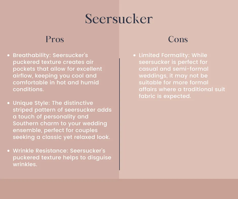 Seersucker is a lightweight cotton fabric known for its puckered texture and distinctive striped pattern, making it a popular choice for warm-weather weddings. Here are the pros and cons: