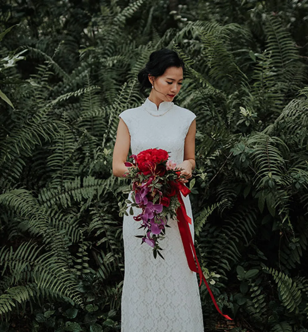 A traditional wedding dress rich in red and often embellished with gold embroidery, the kwa is typically a two-piece attire that includes a long gown and a jacket. It is heavily embroidered with auspicious symbols such as dragons and phoenixes, which represent the balance of male and female power.
