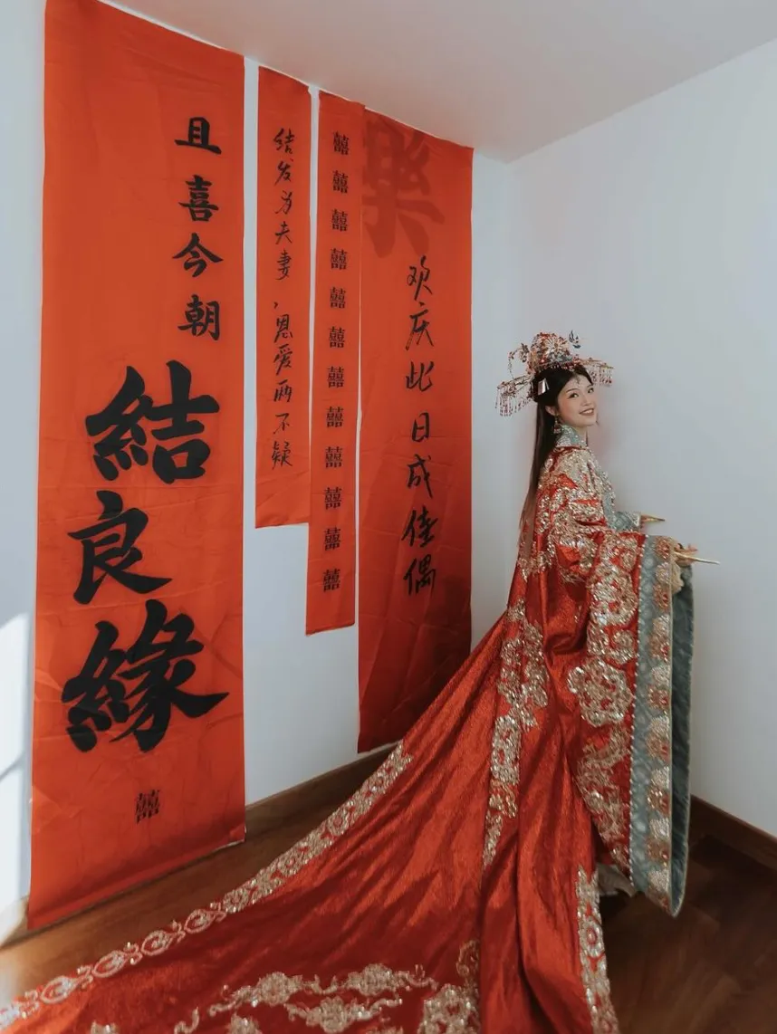 The traditional clothing of the Han ethnic majority, Hanfu for brides typically consists of a robe or a set of robes with wide sleeves and a long skirt. For a highly traditional and elaborate wedding, a bride might wear a phoenix crown—a headpiece decorated with phoenix motifs, pearls, and gemstones that matches her robe. This attire is reminiscent of what was worn by royalty and is reserved for the most ceremonial parts of the wedding, such as the tea ceremony.