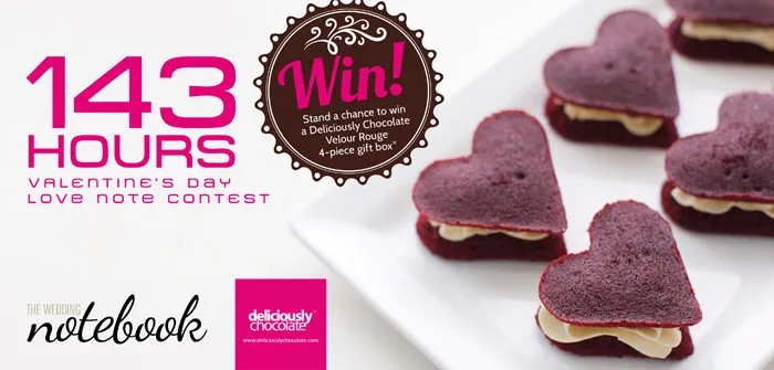 Shortlisted participants will be notified and their notes posted on The Wedding Notebook Facebook page on 14 February. The participants with the three most creative notes will have a Deliciously Chocolate Velour Rouge 4-piece gift box sent right to their special someone’s doorstep with the message. Sweet!