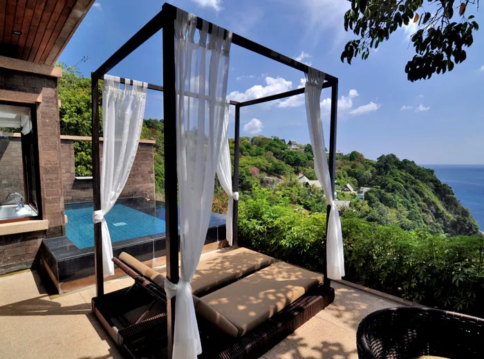 A sensual pool villa experience is assured in the aqua suites, each with a private pool on a large sunny balcony and a four-poster sun lounger. Indoor and outdoor living, luxury bed linens and expansive sea views complete the experience. The bathrooms feature large baths and outdoor showers finished in white terrazzo, warm woods and a touch of Thai influence.