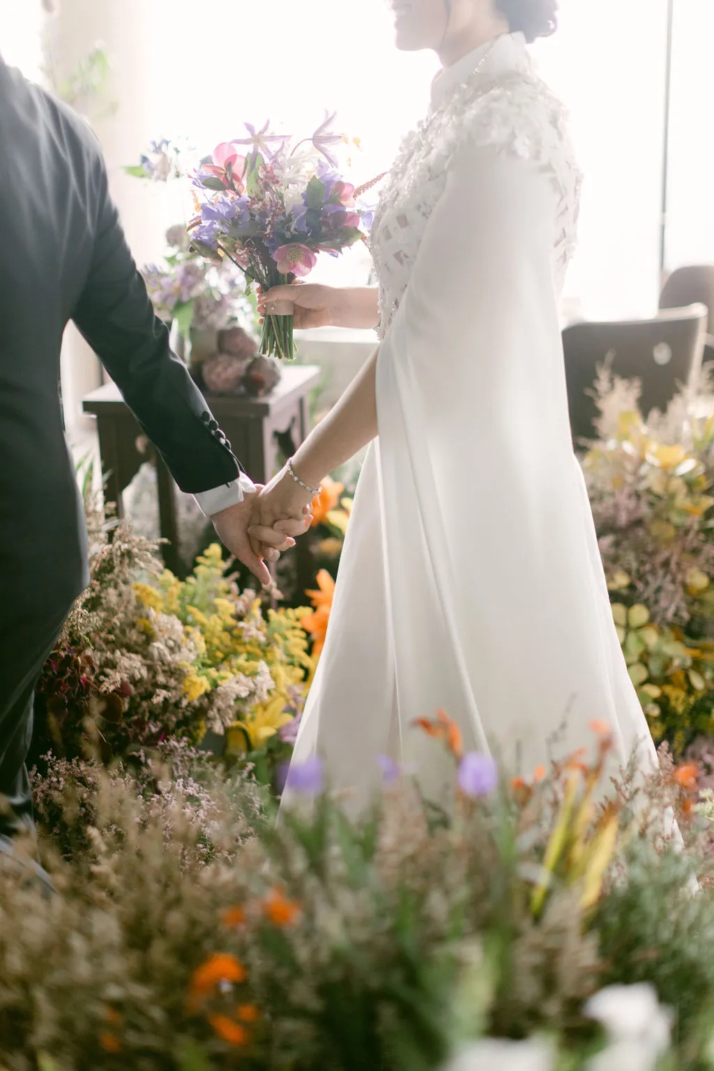 If you envision making a grand entrance and capturing everyone’s attention, the cascading bouquet is the one for you. This opulent style features flowers that flow gracefully downwards, creating a breathtaking waterfall effect. The cascading bouquet is also ideal to be paired with minimal looking dress as it could enhance the entire look of the bride even more. Roses, orchids, and lilies are popular choices for this type of bouquet, as their long stems lend themselves perfectly to the cascading arrangement. Be prepared to dazzle your guests with this dramatic and show-stopping choice.