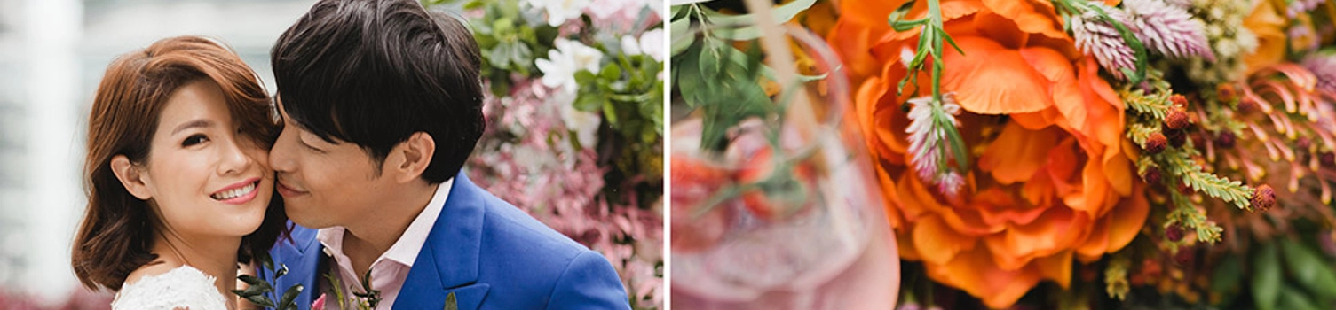 We also have the honour of having Alan Yun and his lovely fiancée Emily for this styled shoot. For this shoot we got Emily something chic – a two piece, intricate lace top with tulle skirt – from Designer Bridal Room, we love how they have something for every type of brides. Alan looking dapper and confident as usual in a royal blue LORD’s tailor suit. We also glam her up with a pastel pink number, to match he was in a blush pink shirt inside and grey suit.