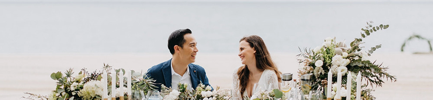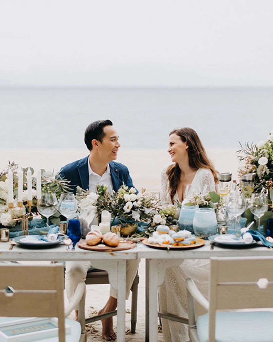 Venue Four Seasons Resort Langkawi / Concept and Styling by The Wedding Notebook magazine / Photography by Peter Herman Photography / Bridal Gown by Pronovias from Designer Bridal Room (white lace dress), stylist’s own (blue tulle skirt) / Groom’s Attire by LORD’s Tailor / Hair and Makeup by Joey Yap Makeup / Flowers and Props by Darling Florist Langkawi & Events Langkawi / Additional Props by The Wedding Notebook magazine / Stationery by The Wedding Notebook magazine / Cake and Desserts by Four Seasons Resort Langkawi