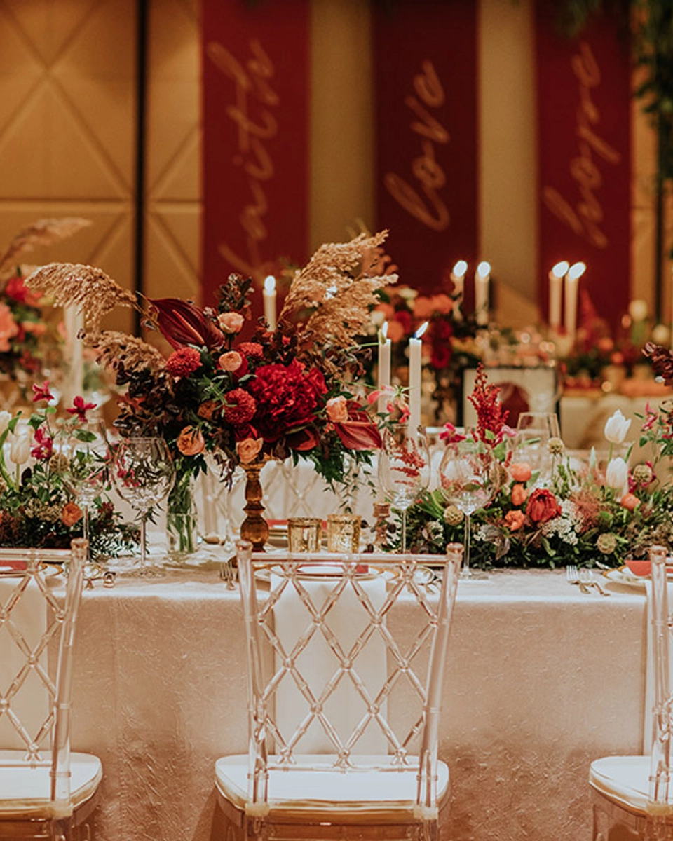 Bringing the garden vibe indoors, The Wedding Notebook team transformed this venue into a glamorous red and gold soiree, complete with Chiavari garden chairs, lush greenery, deep red floral elements, and gilded accessories to dress up the tablescapes. Adding to the warmth of the room was a paper banner backdrop in shades of red, instead of a bare wall. The rouge décor really added to the romance of the entire space, while the gold brought in plenty of glitz and glamour.