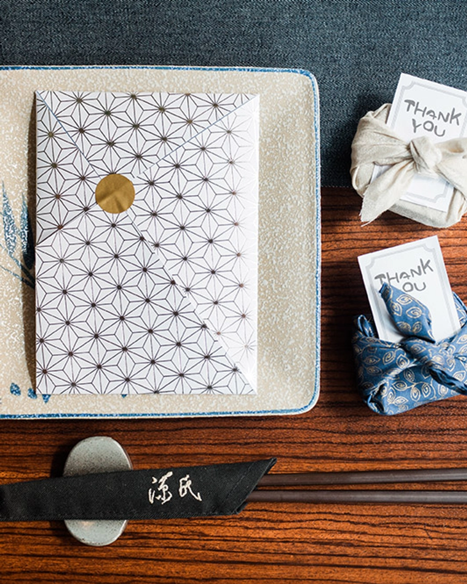 We explored various fabrics such as denim for the table runners and the background for the table number frames. For added texture, favours were wrapped in the Japanese Furoshiki style. This extended to the stationery design, with the menu featuring the silver stamping of a famous traditional Japanese pattern, the Asonoha Hemp Leaf Motif, and finished with an intricate folding.