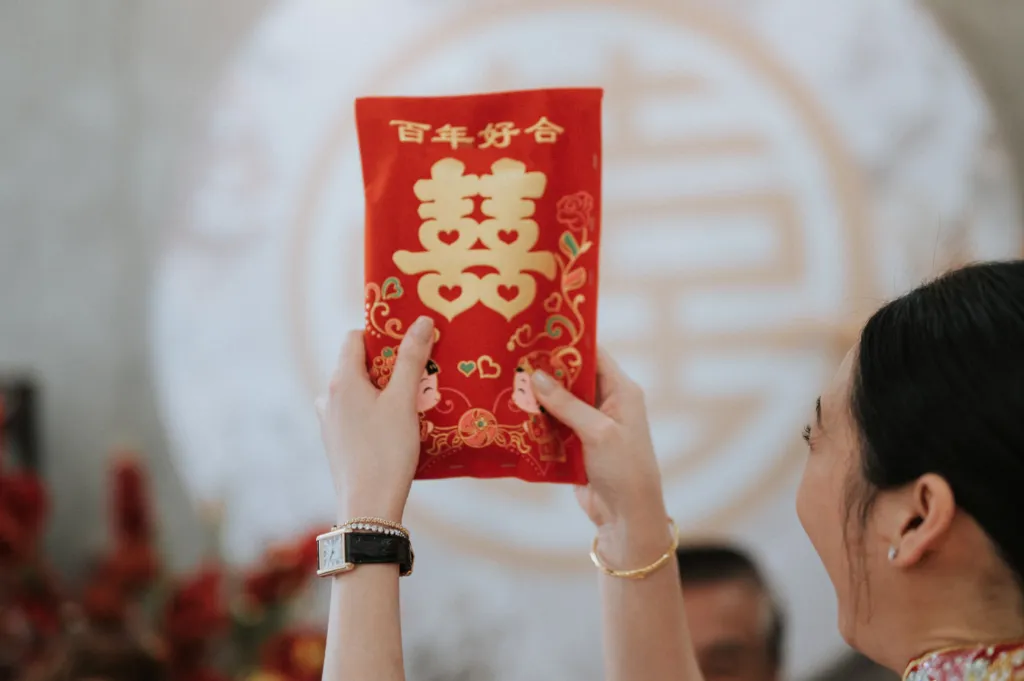 Estimate the number of unmarried cousins and young children who will be present and prepare red packets that will be handed out by the bride and groom.