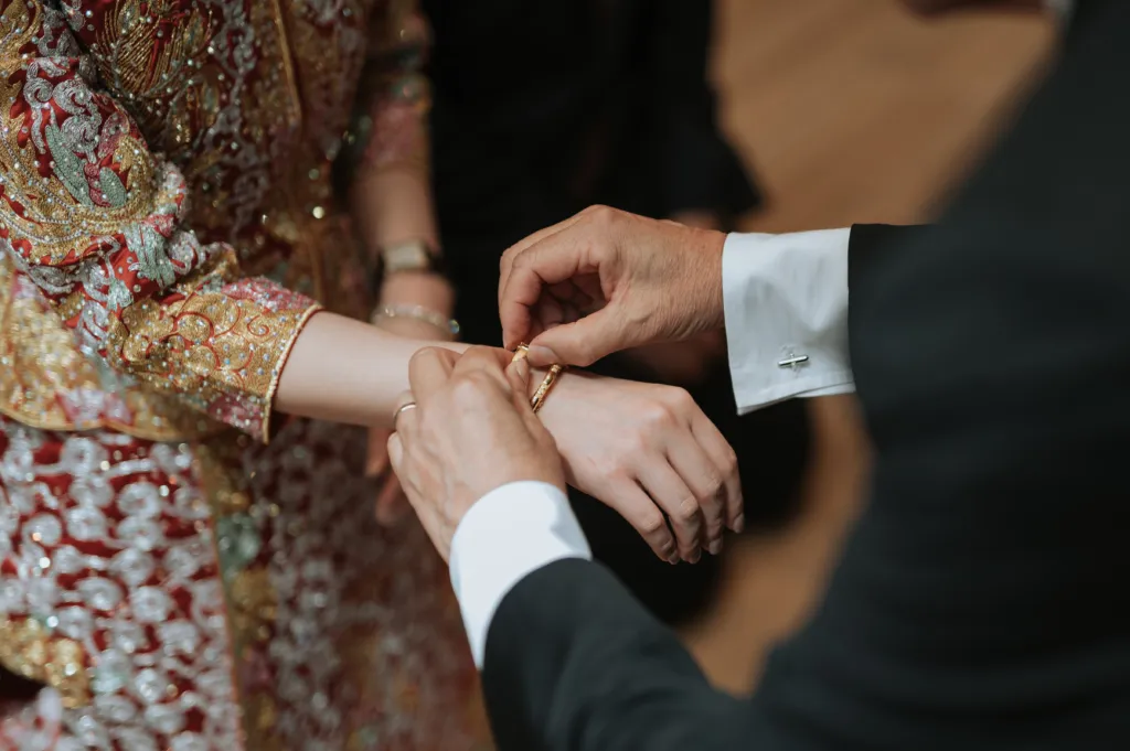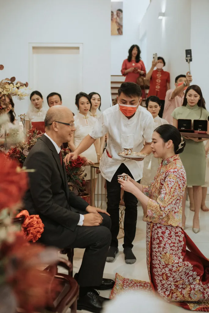 Customs differ slightly according to various regions. In general, basic etiquette should not differ. The tea ceremony starts with the bride’s parents and relatives, followed after by the groom’s family. The groom kneels in front of his father-in-law and the bride before her mother.