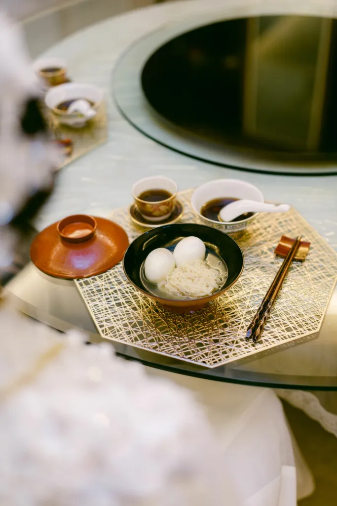 Glutinous rice ball soup or longevity noodles for the newlyweds are prepared according to family’s origin and background.
