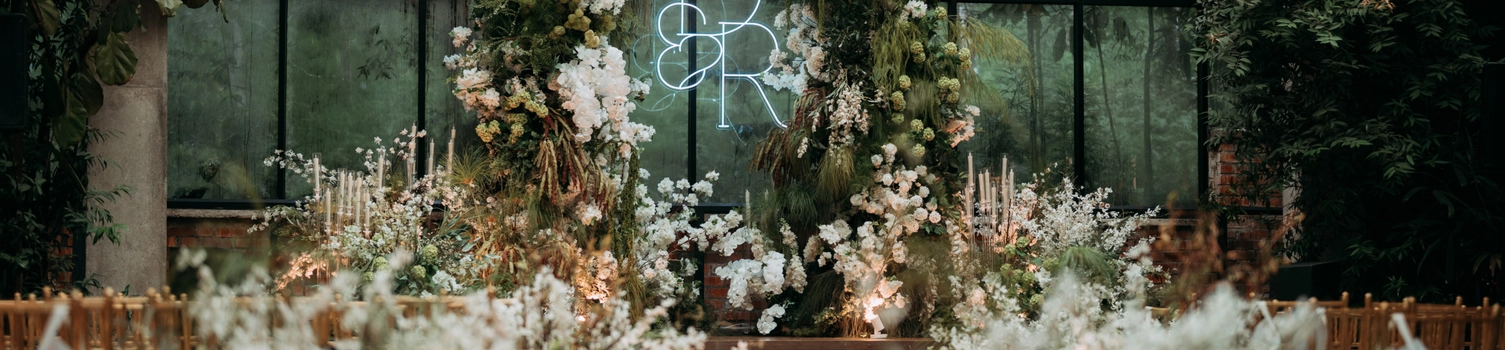 Towering glasshouse ceiling with soaring greenery to match and carefully ungoverned shrubberies naturally fills this space. Little is needed to elevate the look of this mature verdant space, making it the go-to for those looking to have a garden wedding with the convenience of the indoors