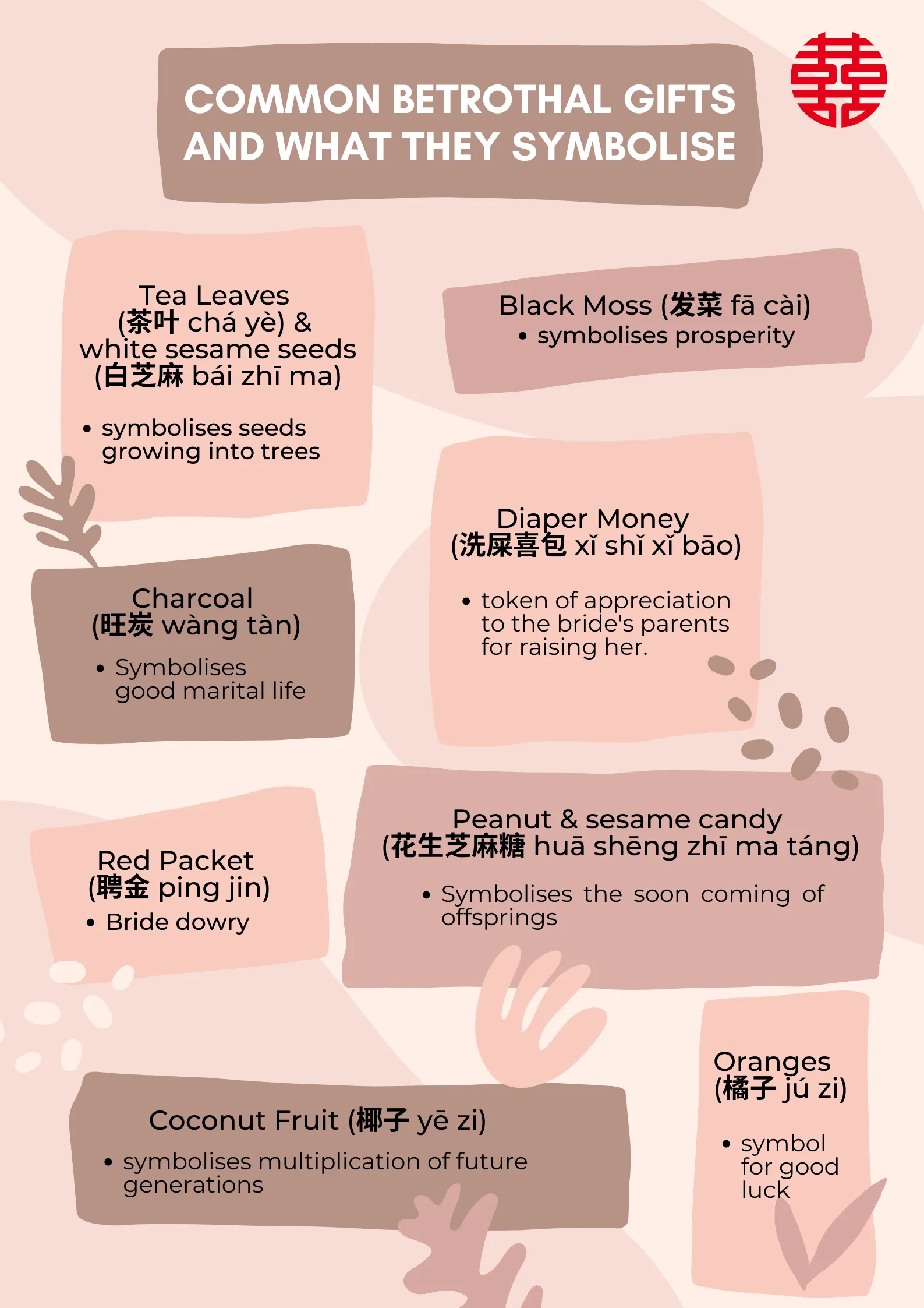 Guò Dà Lǐ (过大礼) or the Chinese betrothal ceremony is the official proposal ceremony in Chinese customs. It Involves the gifting of betrothal gifts from the groom to the bride’s family as a sign of his sincerity and towards marrying the bride and his assurance that she will be well taken care of after marriage. Read on to learn more and download the FREE checklist below.