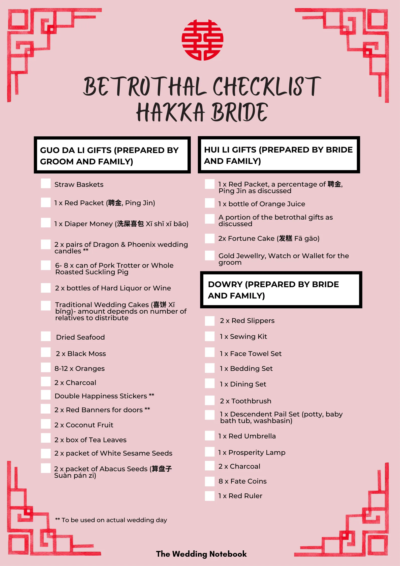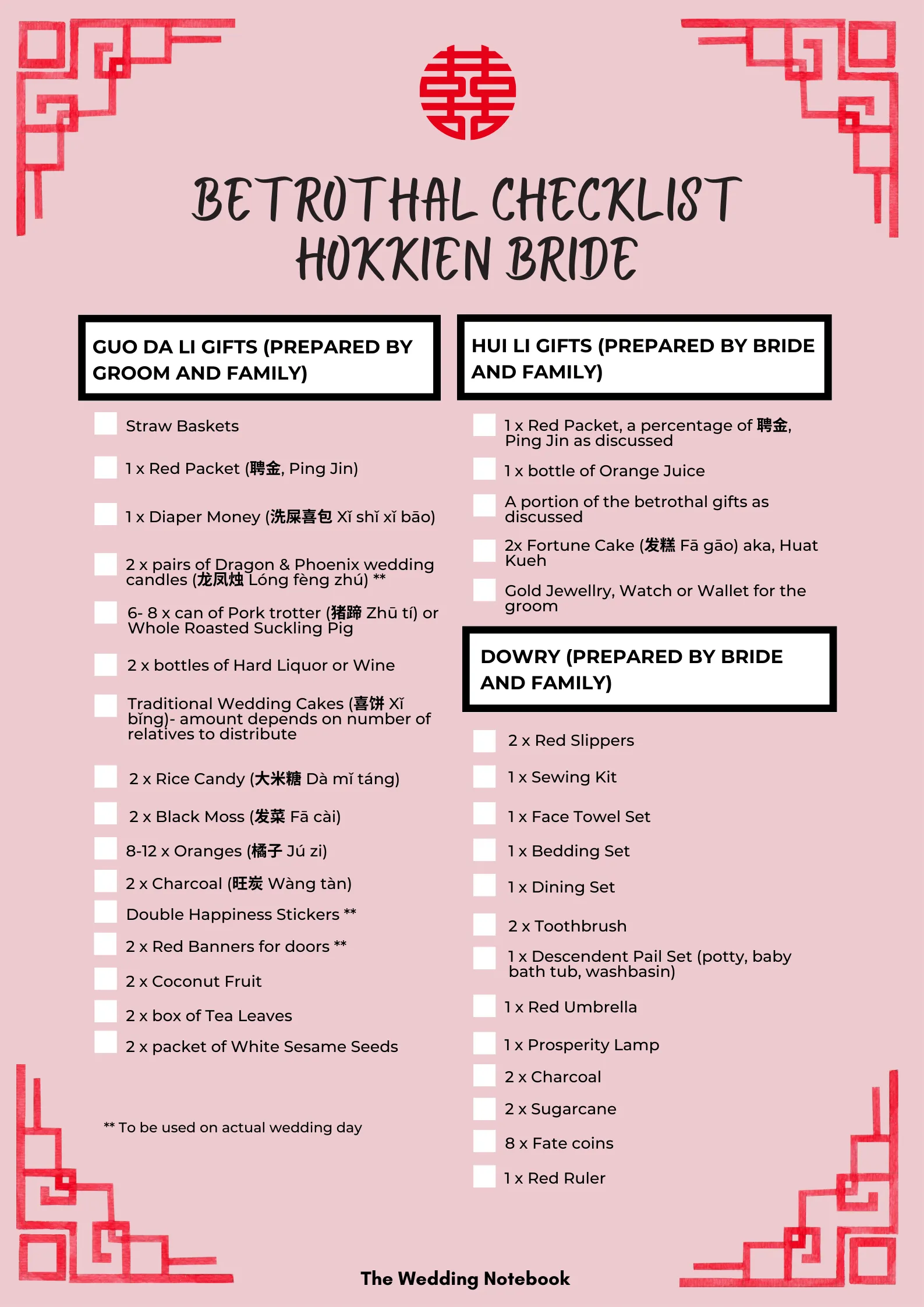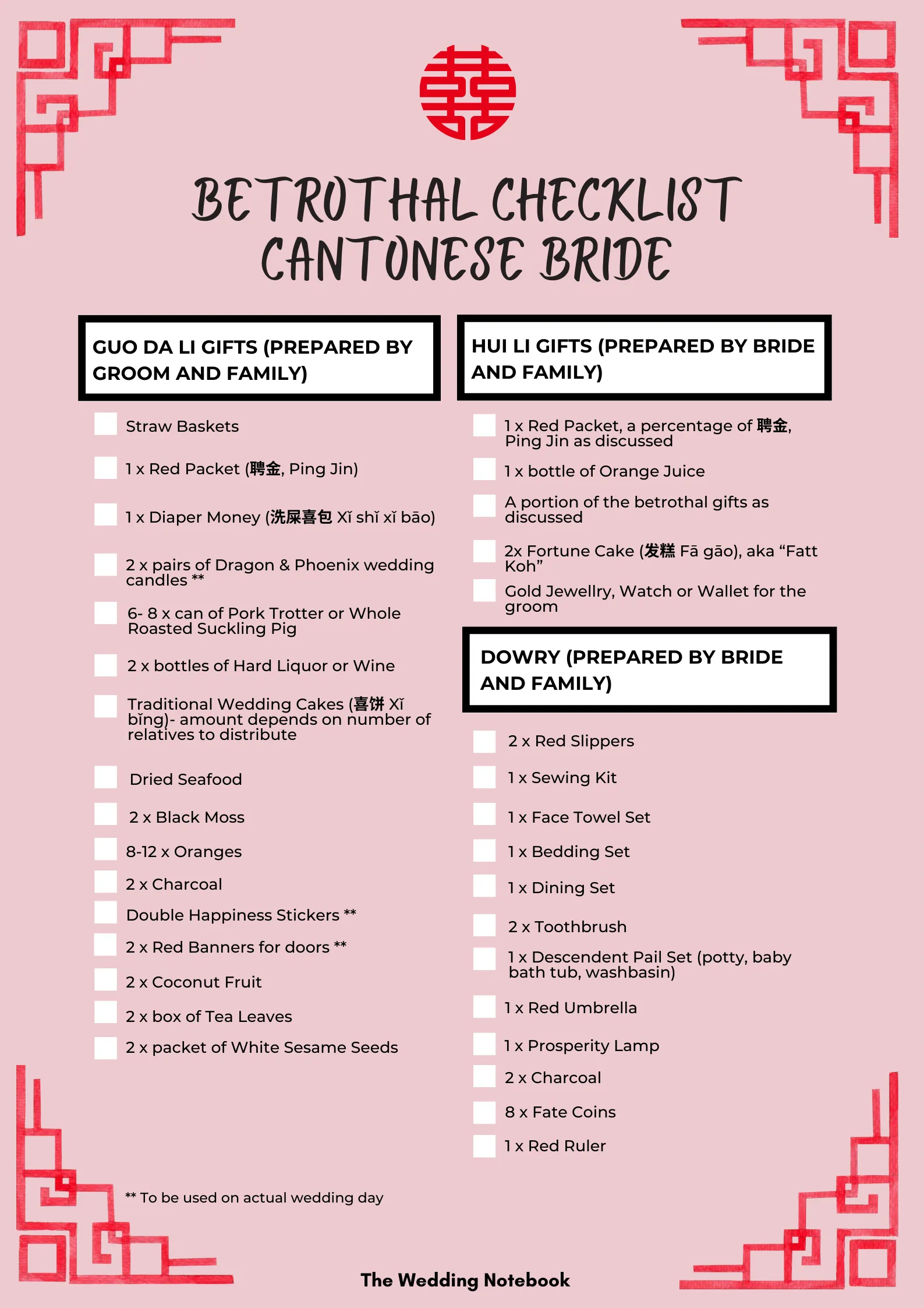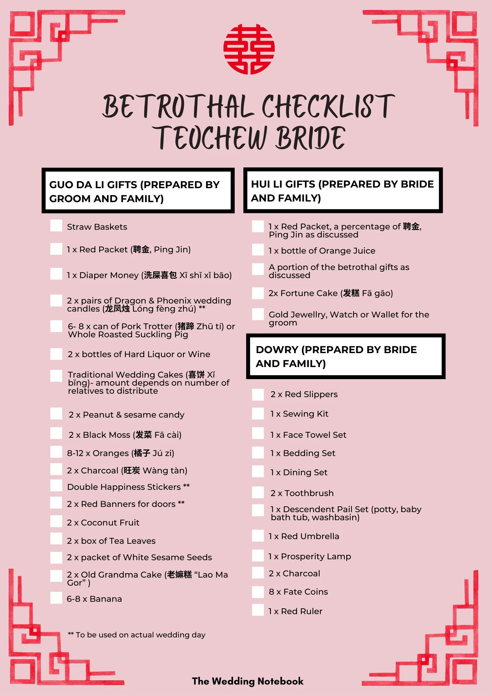 This is a guide of the common gifts included in Guo Da Li ceremony and their symbolism. However, both families would have agreed on a list of common items which may or may not include additional gifts that may be of certain significance to the bride’s family. Also included to download for FREE is The Wedding Notebook’s betrothal gift shopping checklist based on your family’s dialect groups below.