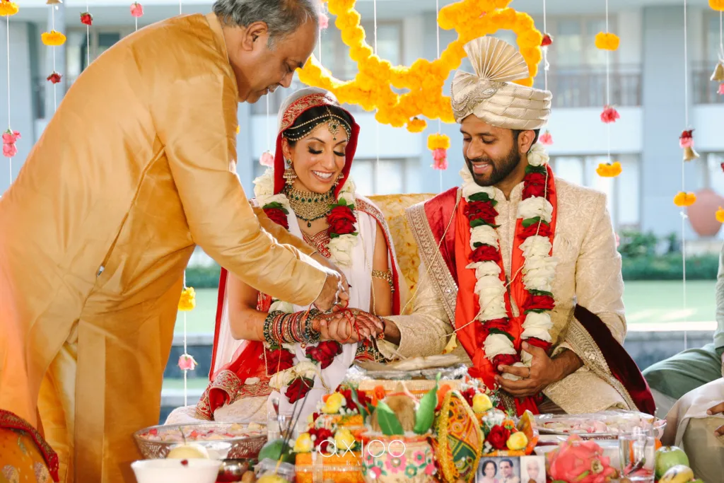 The kanyadaan ceremony marks the bride’s father or guardian’s “giving away” of her hand in marriage to the groom, literally: The bride’s hand is placed in the groom’s, and the groom is made to promise his commitment to the bride and their relationship. The couple then trade wedding bands.