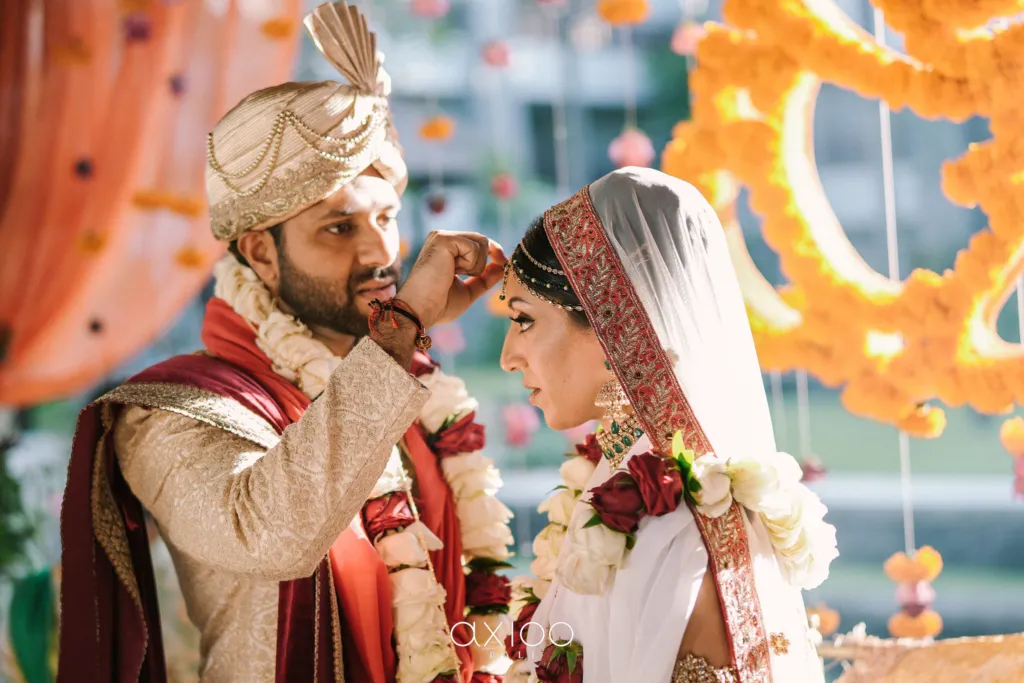 The couple graces each other with a garland of flowers as a symbol to welcome one another into their families. The newlyweds also shower each other in rice mixed with saffron and turmeric as a symbol for fertility and prosperity in their future life.