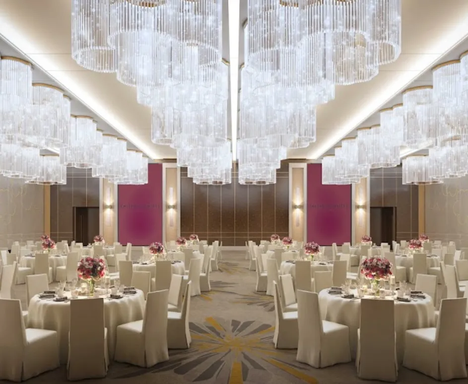 Located within the heart of the city lies The Pavilion Hotel, Kuala Lumpur. A stone’s throw from Pavilion Kuala Lumpur this is as convenient as a location can be. Lesser known is its centre court which is an outdoor courtyard flanked by a 90 feet cascading water feature. The cherry on top of this area is the skylight roof suspended from the 18th floor that would shield guests from both rain and heat. The centrecourt is minimally decorated, only 15 foot trees stand in rows on either side which makes this space less challenging for your decorator. Chairs and small tables will be provided but decorations, sound systems, projectors would have to be outsourced. The reception can be held in the contemporarily decorated Pavilion Ballroom that can accommodate 18 round tables. The ballroom is fitted with basic amenities and has a beautiful foyer for cocktails.