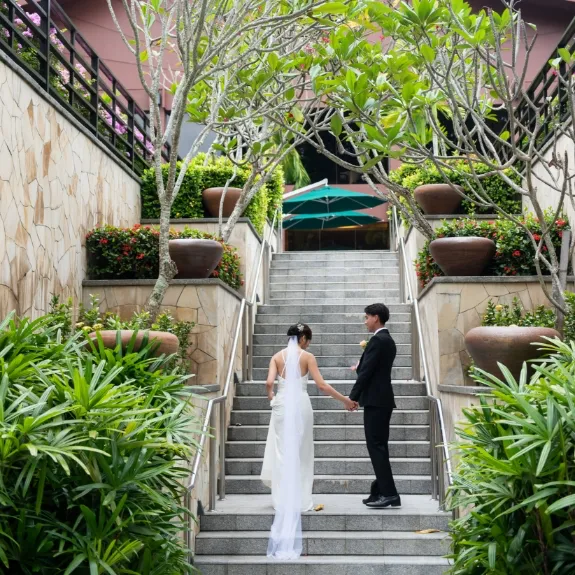 The real magic, however, lies outdoors. The Garden Lawn (150 pax) is a dreamy, open-air space framed by tropical palms—perfect for vow exchanges. The Terrace (70–100 pax) offers a cosy yet elegant setting for pre-dinner drinks or intimate ceremonies, while the Baba Bar adds a relaxed, Peranakan-inspired atmosphere by the pool. For larger receptions, the Rafflesia Ballroom hosts up to 320 guests in a classic indoor setting. Meanwhile, Madam Lee Nyonya Restaurant provides an exquisite spot for a welcome dinner or private reception, complete with rich local cuisine and heritage ambiance.