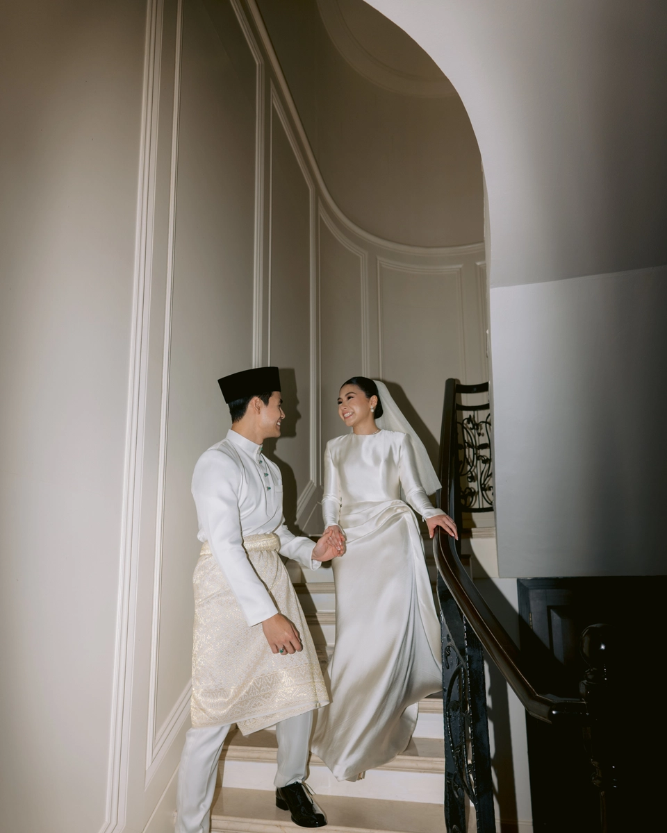 Traditional attire is being elevated with couture tailoring—think hand-beaded baju kurung or structured kebayas in silk organza. Couples are swapping conventional pelamin for artistic floral installations or heritage-inspired backdrops.