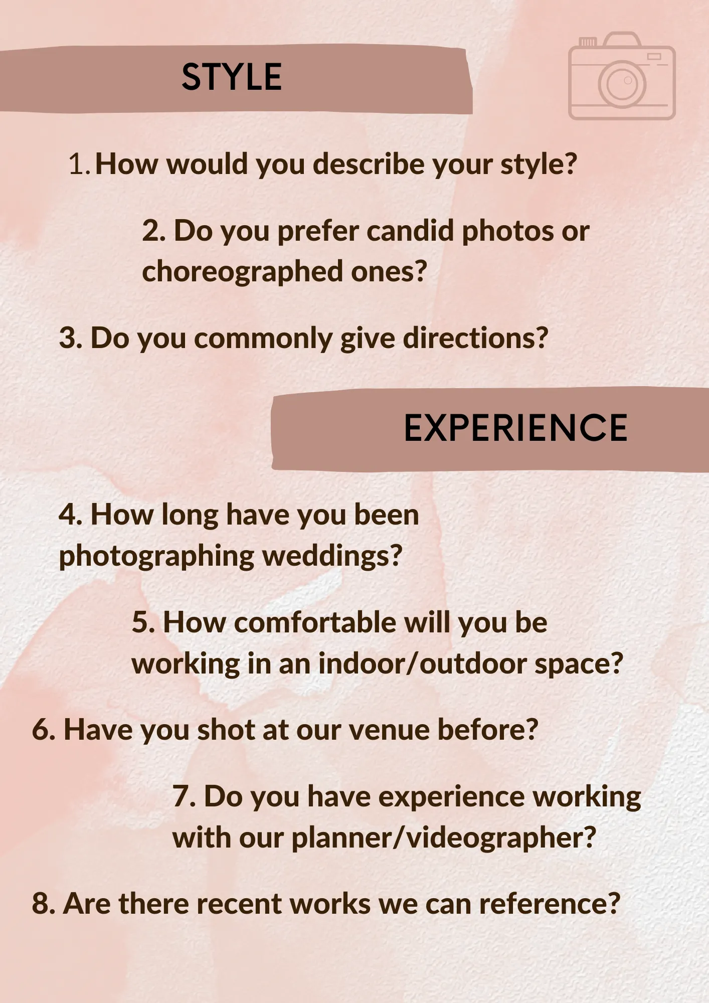 Ask also if they are familiar shooting weddings that are held in a similar setting as yours – indoor or outdoor. Ask if they had experience covering weddings at your venue, and if not, will there be a site visit before the actual day? Finally, ask if they have worked with your other major vendors prior to this – namely your planner and videographer, should you choose to have one.