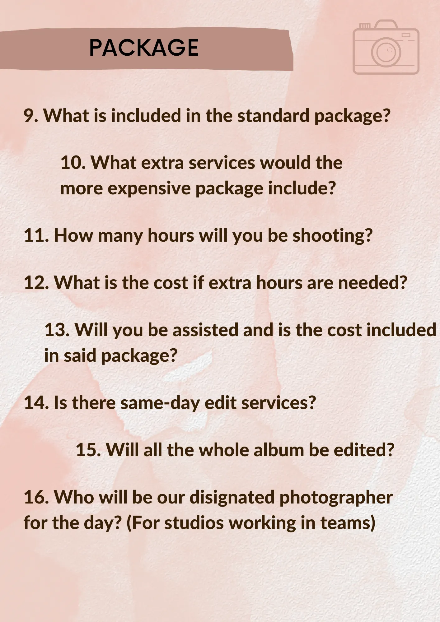 What is included in the standard package, and what extra services is included in more expensive packages? How many hours will your photographer be shooting and how much is the fee for additional hours? Will he or she be assisted and is the additional help included in the package? Ask if there is same-day edit and if all the photos will be edited.