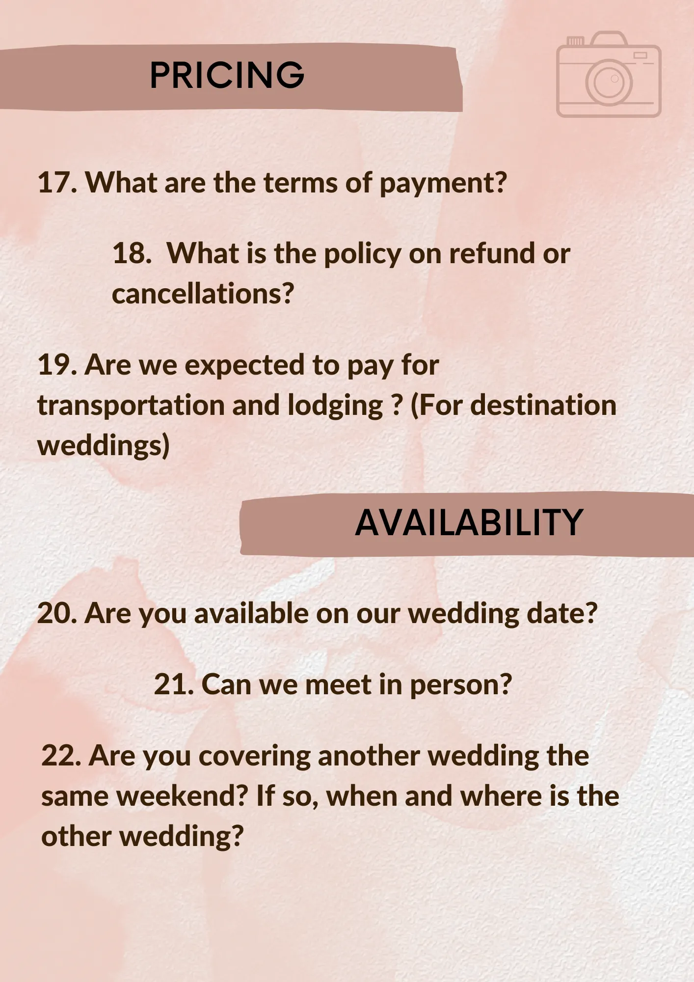 Pricing can vary tremendously. Is a particular photographer within your budget? If not, is he/she worth the difference? Another thing you might need to ask the photographer about is payment terms – deposit, instalments etc. We suggest the earliest you pay your final payment is on the wedding day itself. Ask also about refund or cancellation policies.