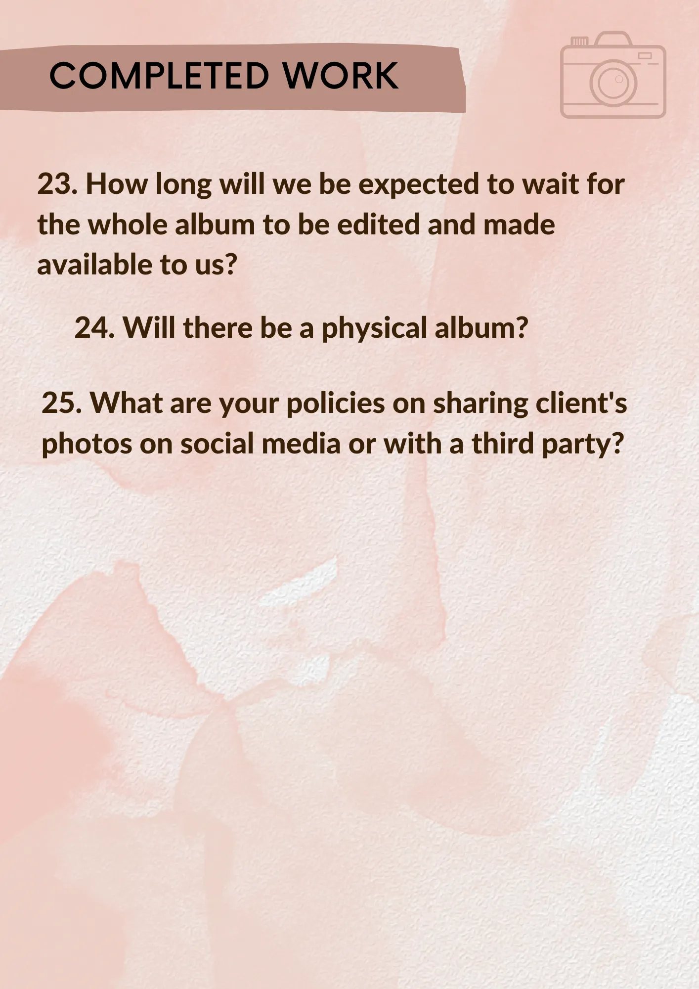 How long will you be expected to wait for the whole album to be edited and made available to you? Will you receive a physical album or a digital one? Will the photographer have rights to your pictures and be able to share them freely?