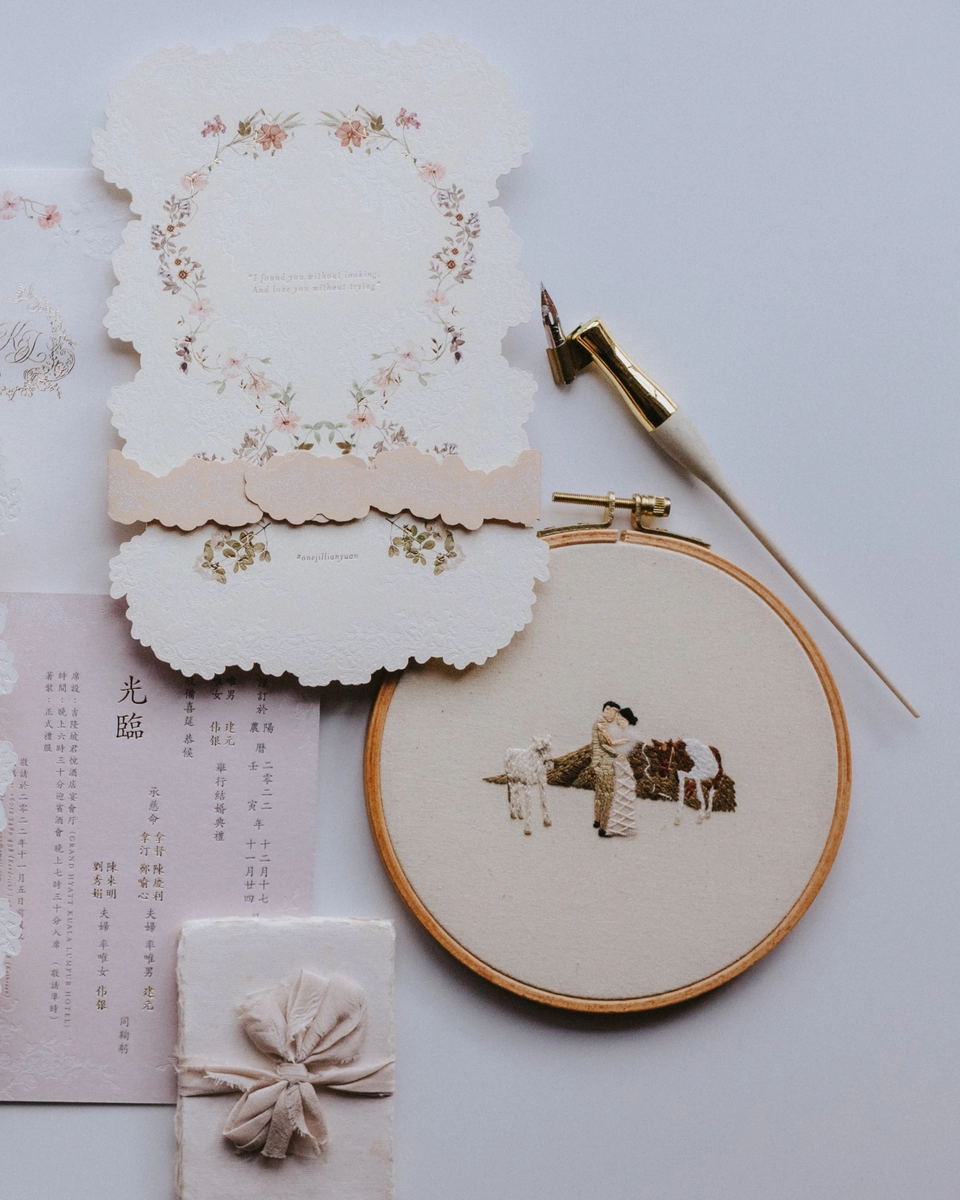 Fabric Swatches: If you’re incorporating special fabrics in your attire, like songket or lace, save small pieces or request them from your tailor for the flat lay. Alternatively, adding a fabric swatch of your main colour in the wedding palette adds a soft romantic touch to the photo arrangement.