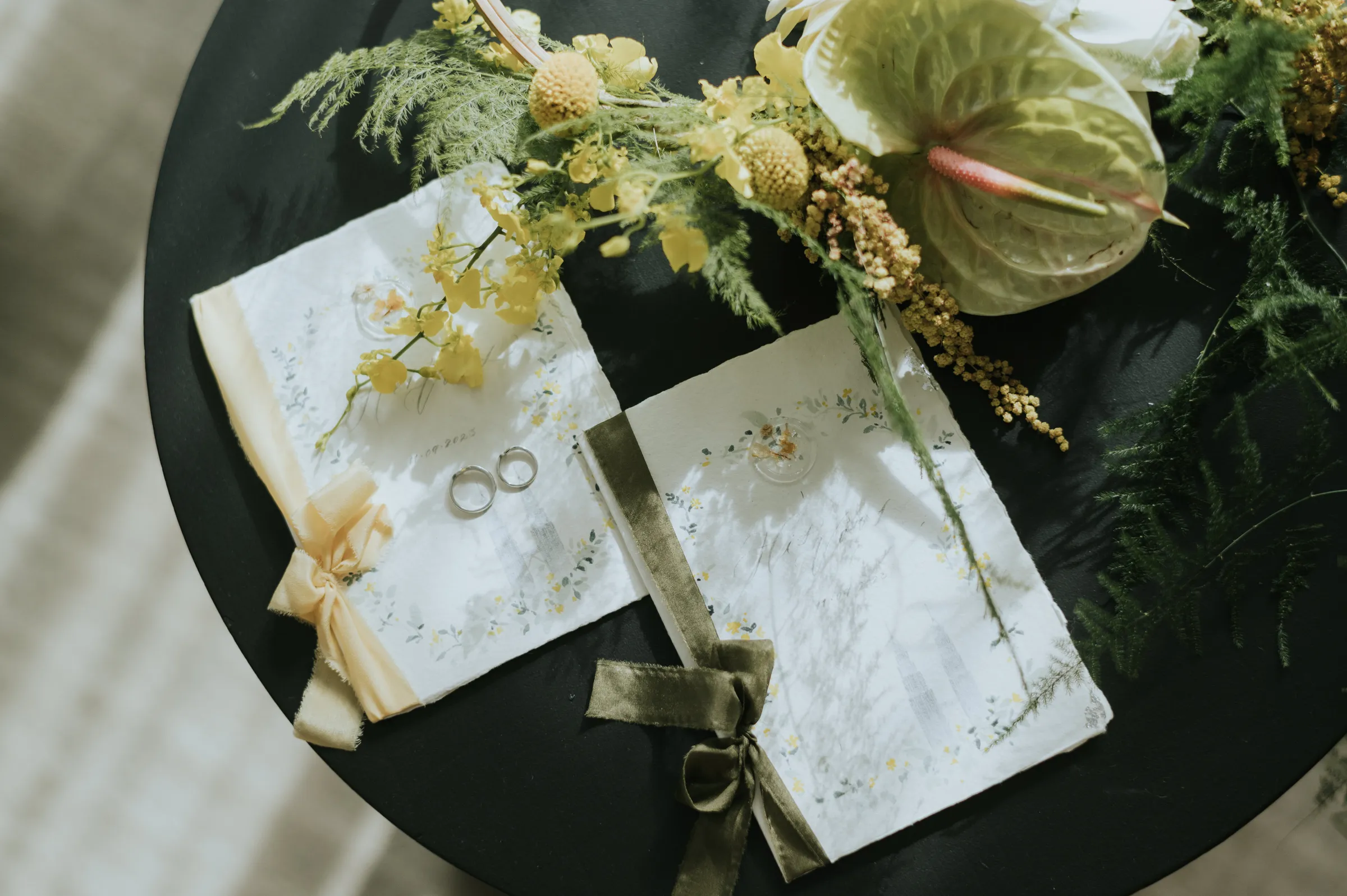 Floral Elements: Talk to your florist in advance about setting aside a few extra blooms or leaves from your bouquet for the flat lay. This ensures the flowers are fresh and match your wedding theme.