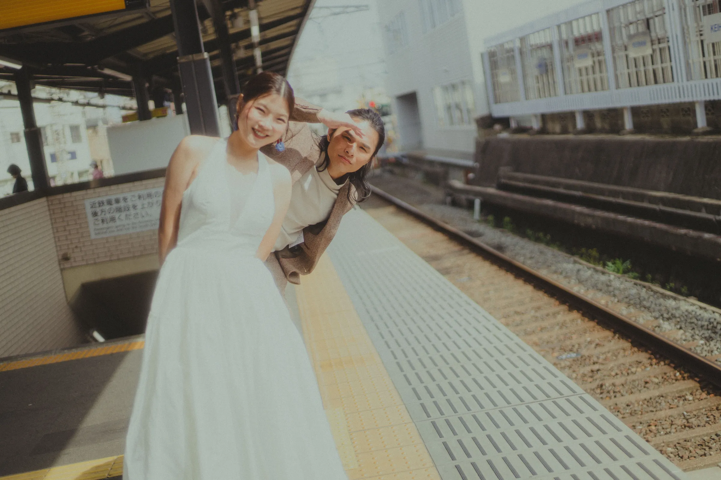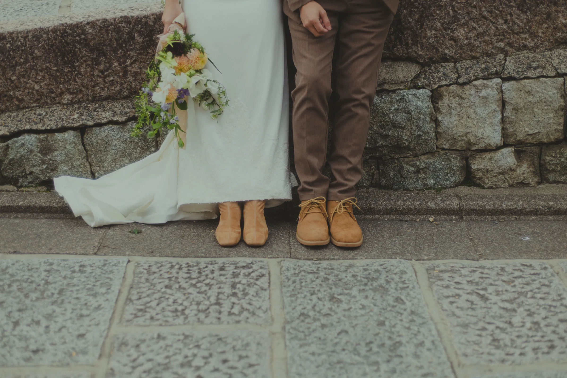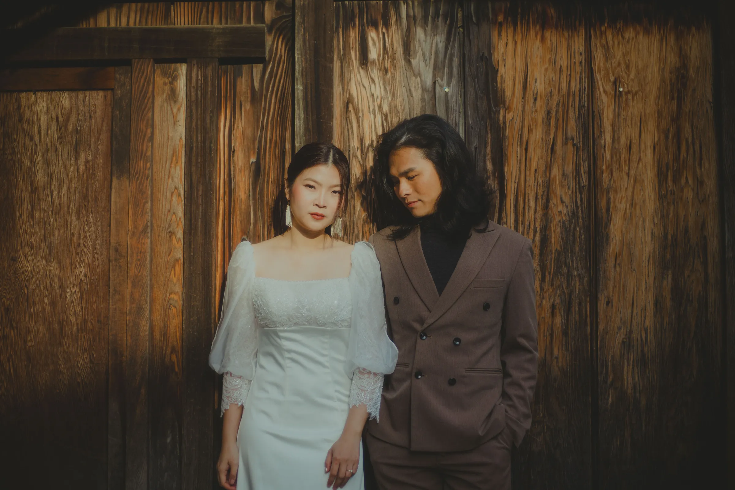 Zeey is dressed in a modest white gown with delicate lace details, perfectly complementing the traditional Japanese settings. Her attire is accentuated by a simple bouquet of vibrant wildflowers, an simple yet stand out accessories. Chun Hui, on the other hand, dons a stylish brown suit, exuding a blend of modern sophistication and traditional elegance. His outfit harmonises beautifully with the rustic and serene backdrops of Kyoto.