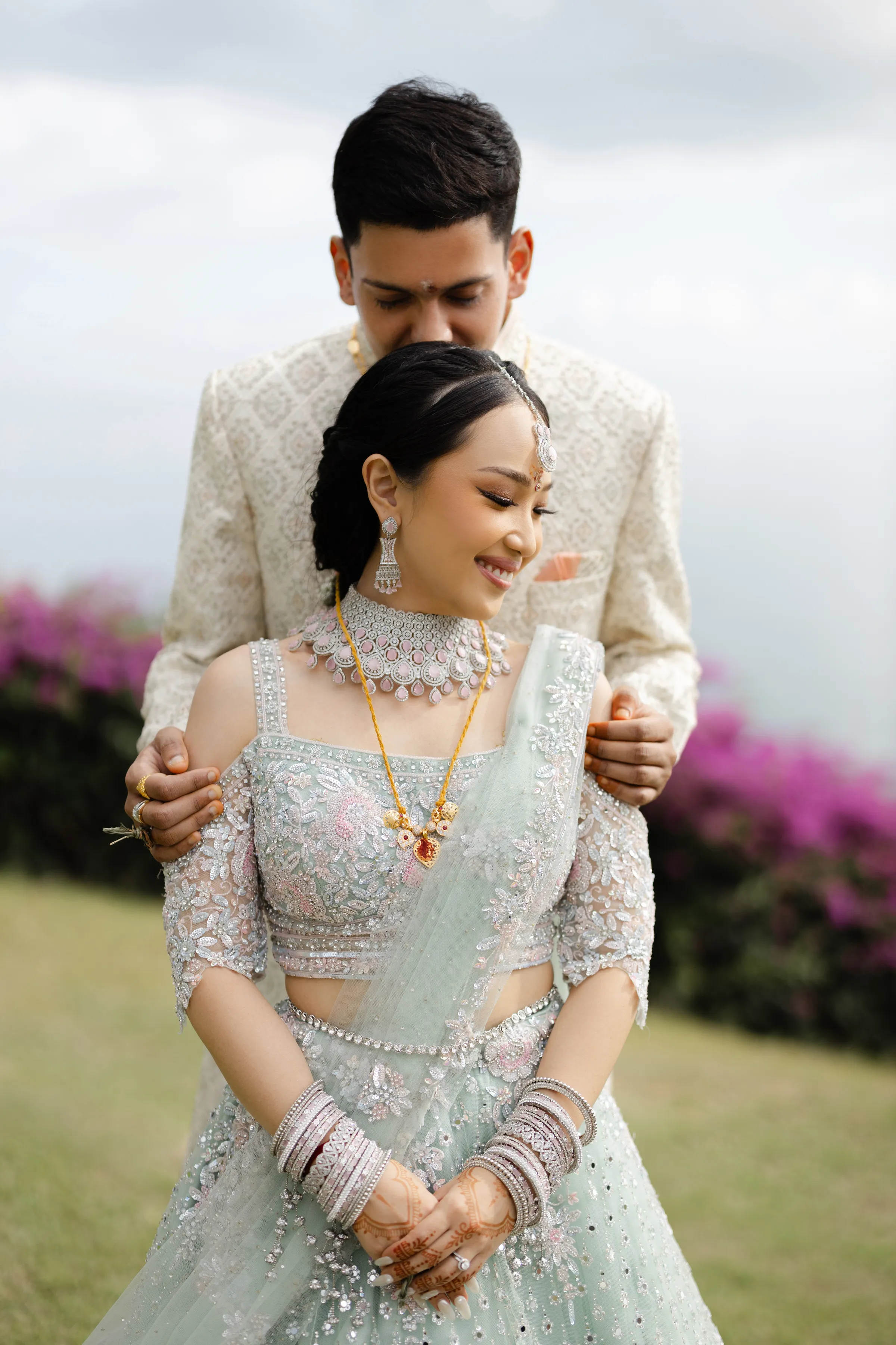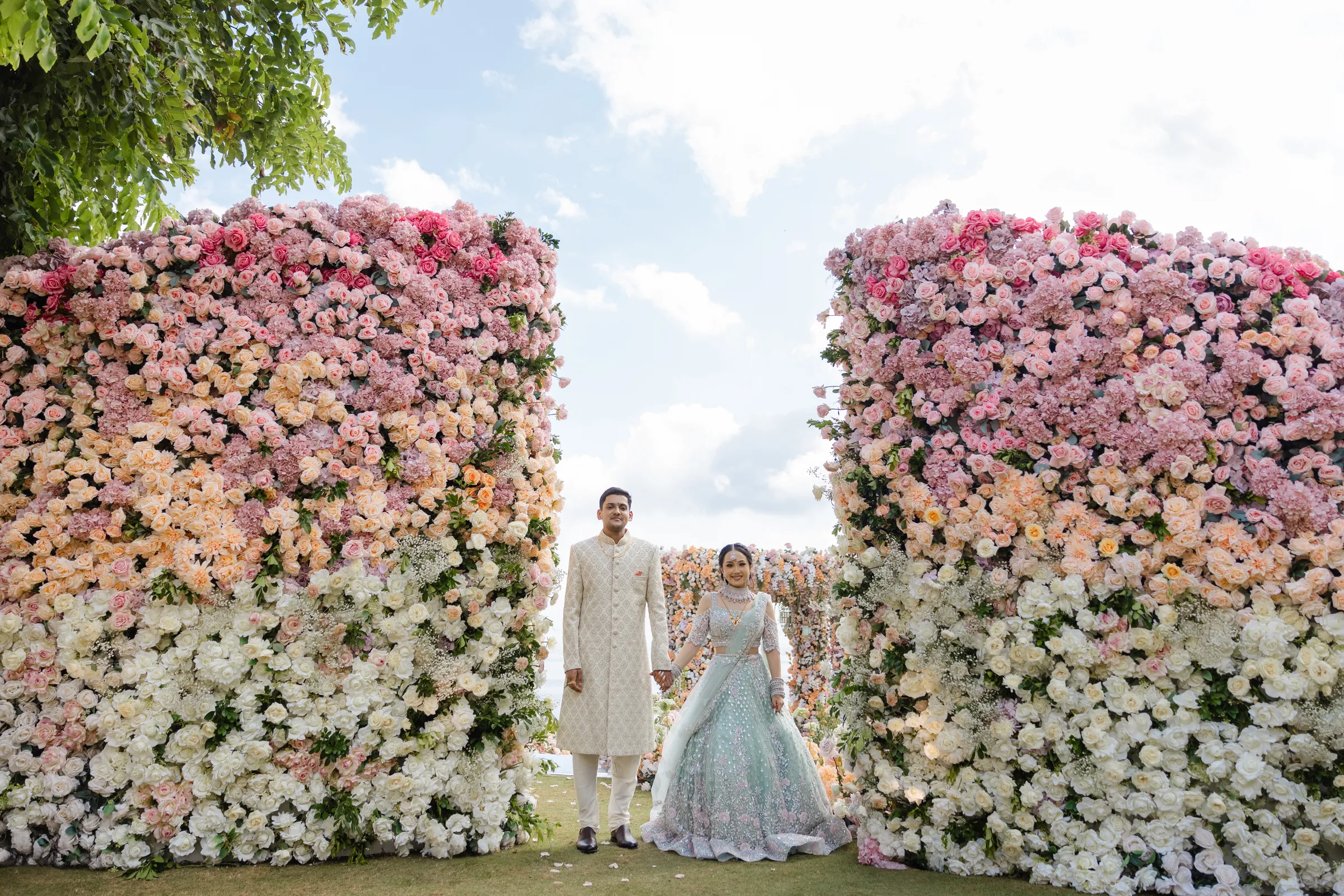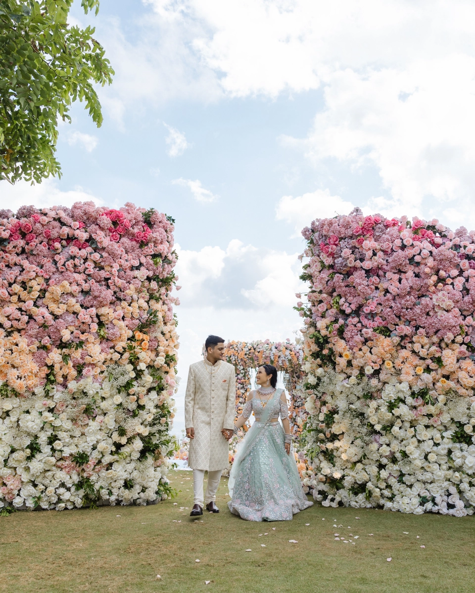 The morning air at AYANA was crisp with excitement as guests arrived, the space already pulsing with the vibrant energy of an Indian wedding. As the traditional rites commenced, Michelle, adorned in a modern sari, was a vision to behold. Her attire was a symphony of tradition and modernity, with every fold of the fabric telling a story of cultural pride. The sari draped her like a second skin, while the glint of diamante accessories added a celestial glow to her bridal beauty. Wikki, her counterpart, mirrored her elegance with his princely demeanor, his ensemble speaking volumes of the grandeur of Indian heritage.