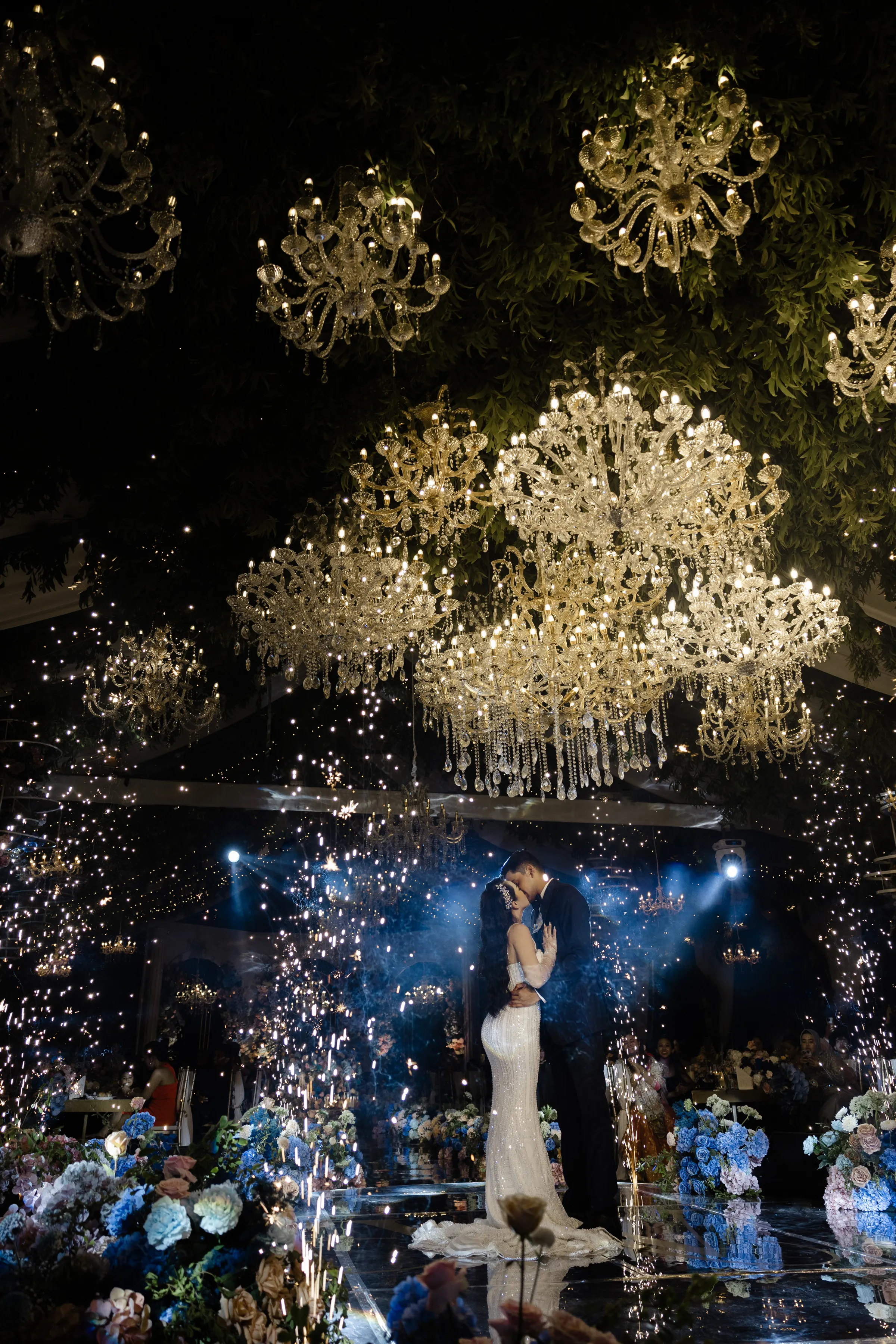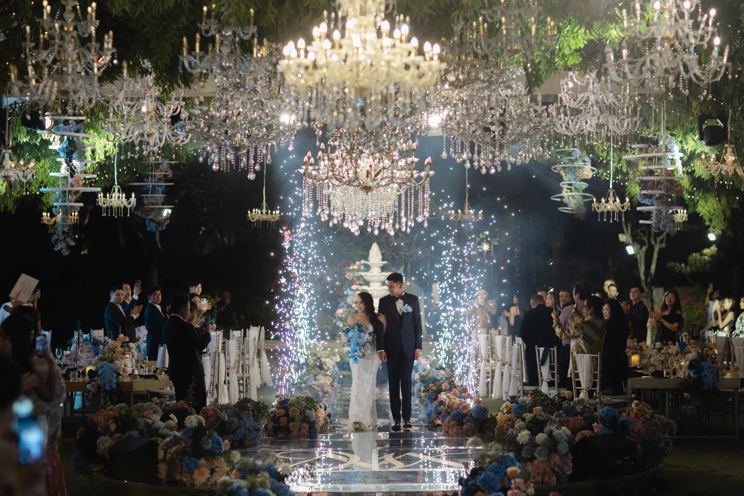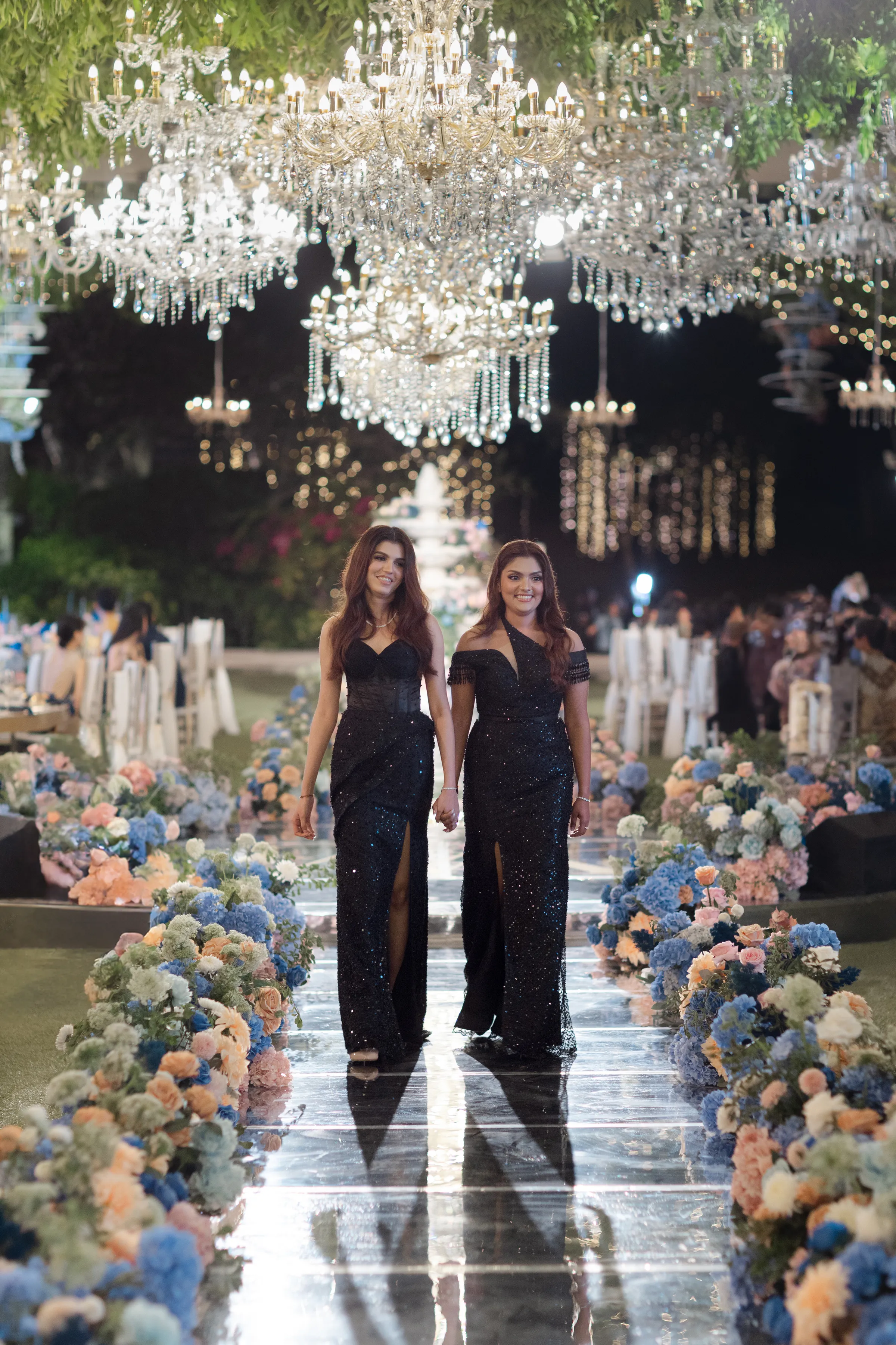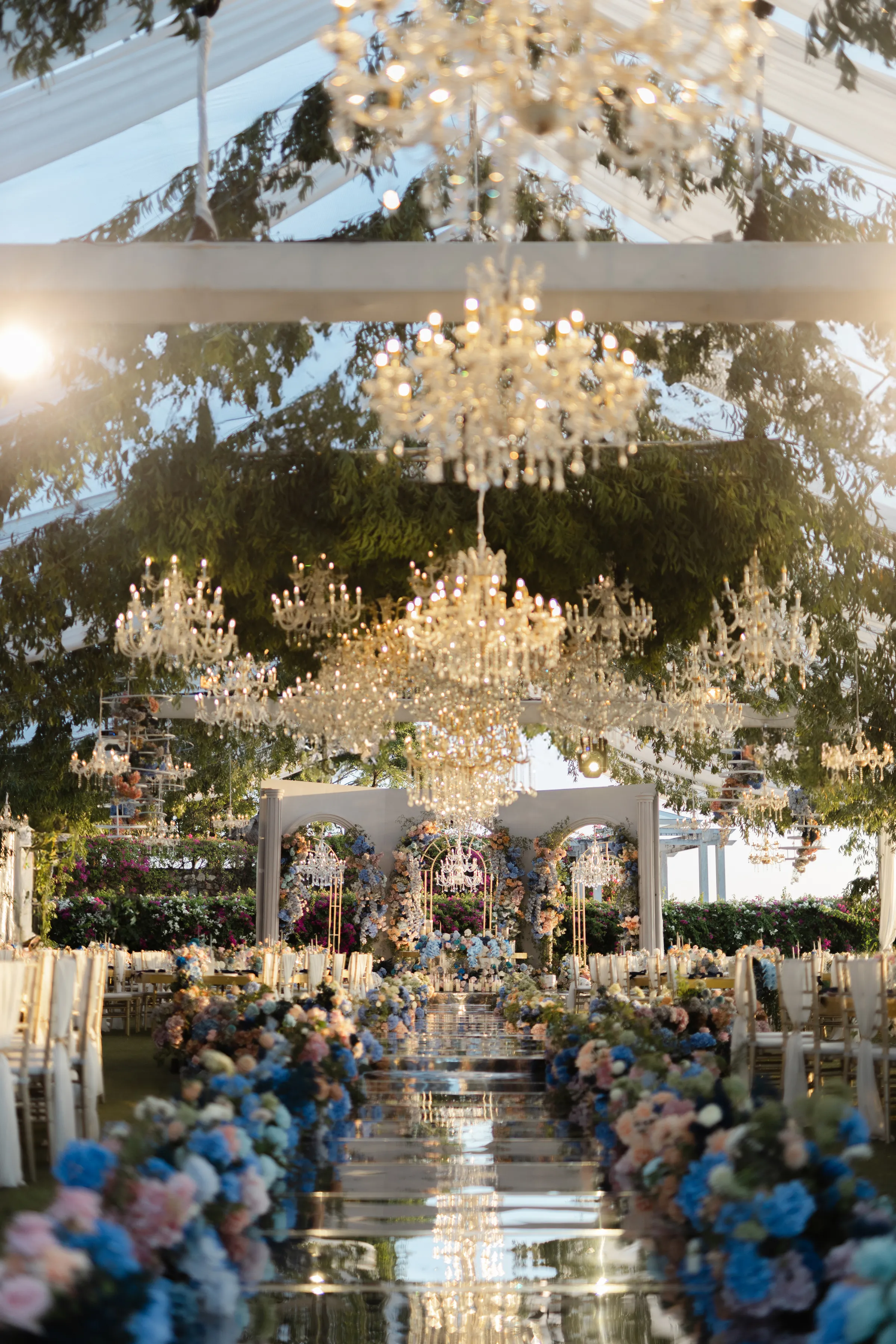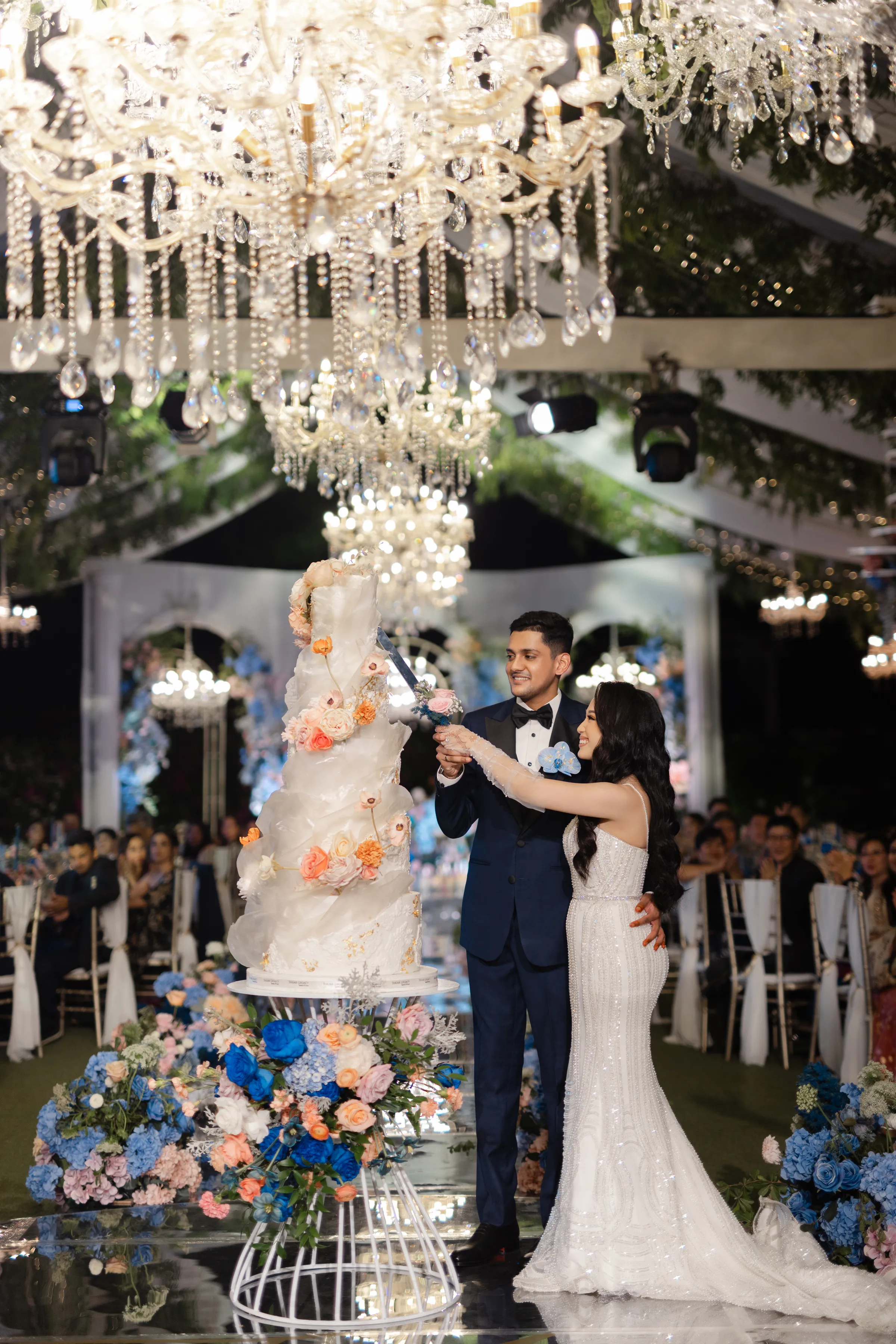 As the day ebbed into evening, the venue transformed, as if by a wave of a wand, into a modern Eden. The traditional brights gave way to a palette of pristine whites and deep blues, the garden itself seeming to have been touched by the night sky. Crystal chandeliers, suspended like stars in the firmament, cast a soft, romantic glow over the celebration.