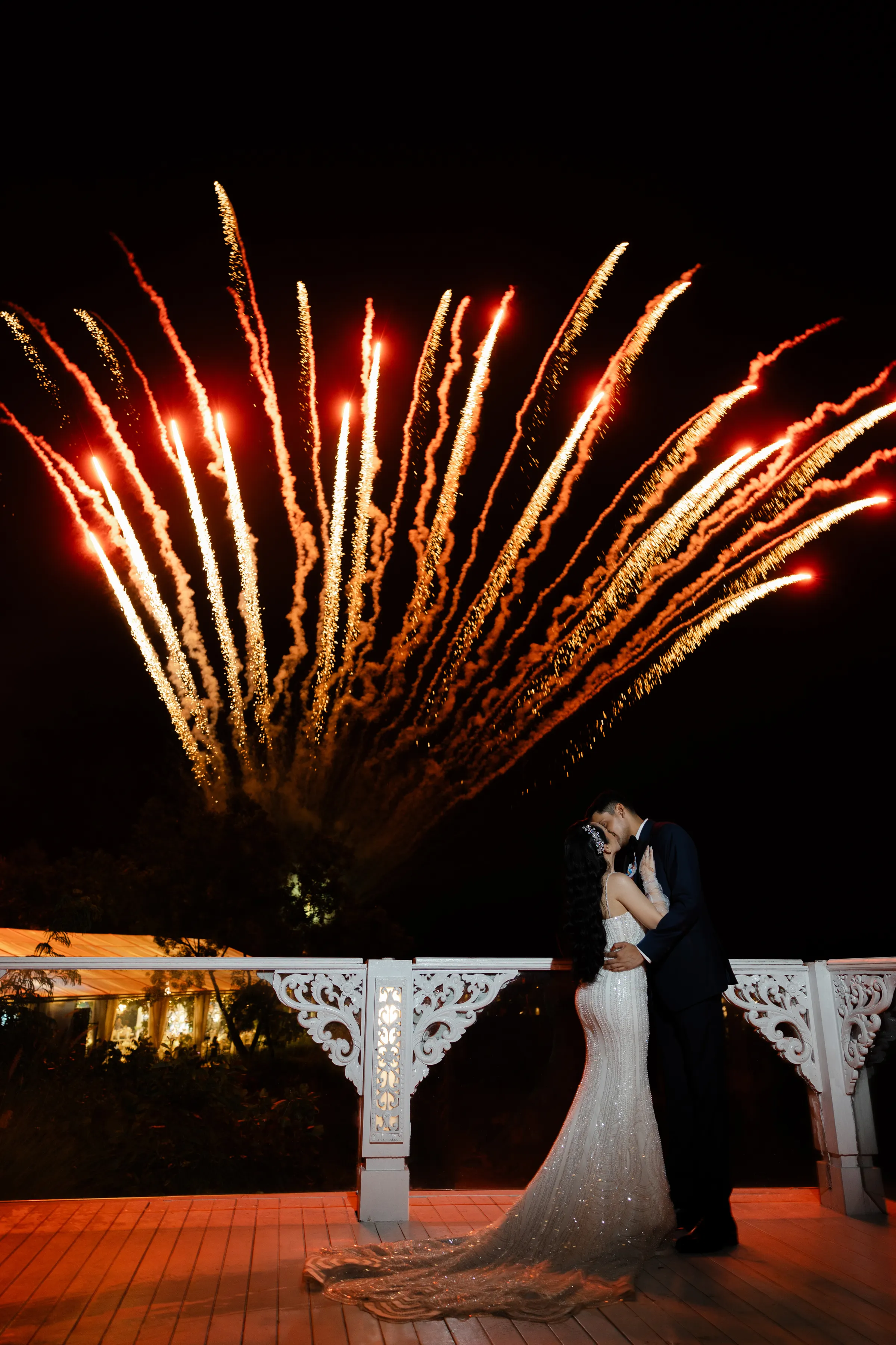 The festivities climax as guests head to the dance floor. As the night wound down, and the guests bid their adieus, the air was still warm with the glow of the day’s festivities. The couple shared an intimate moment as the skies burst alit with fireworks, a fitting docket to end the night.