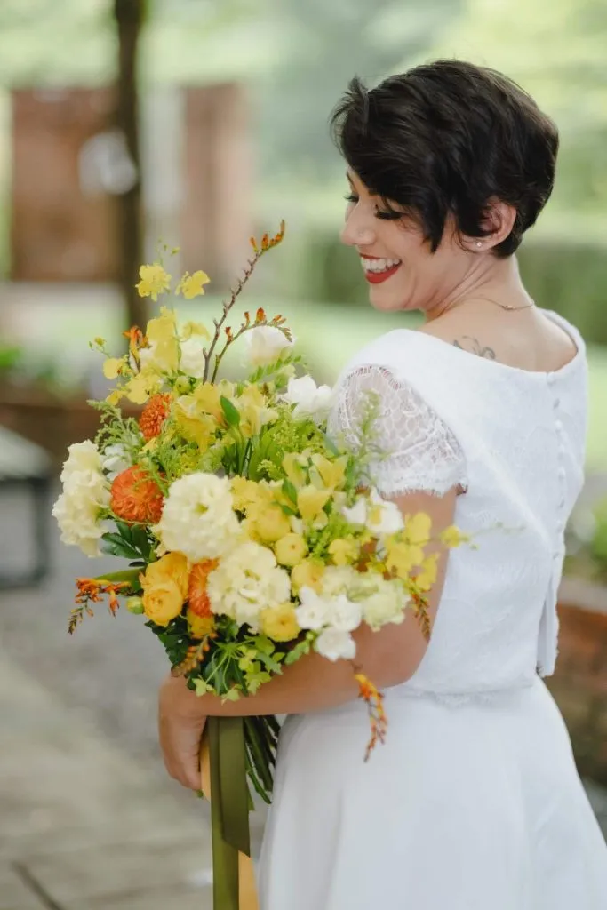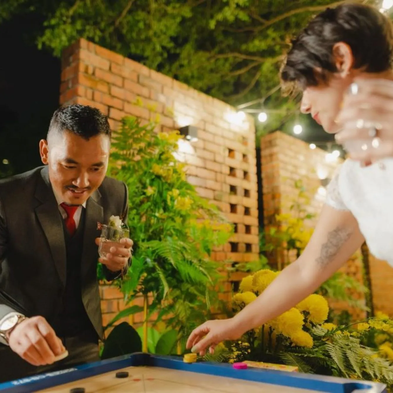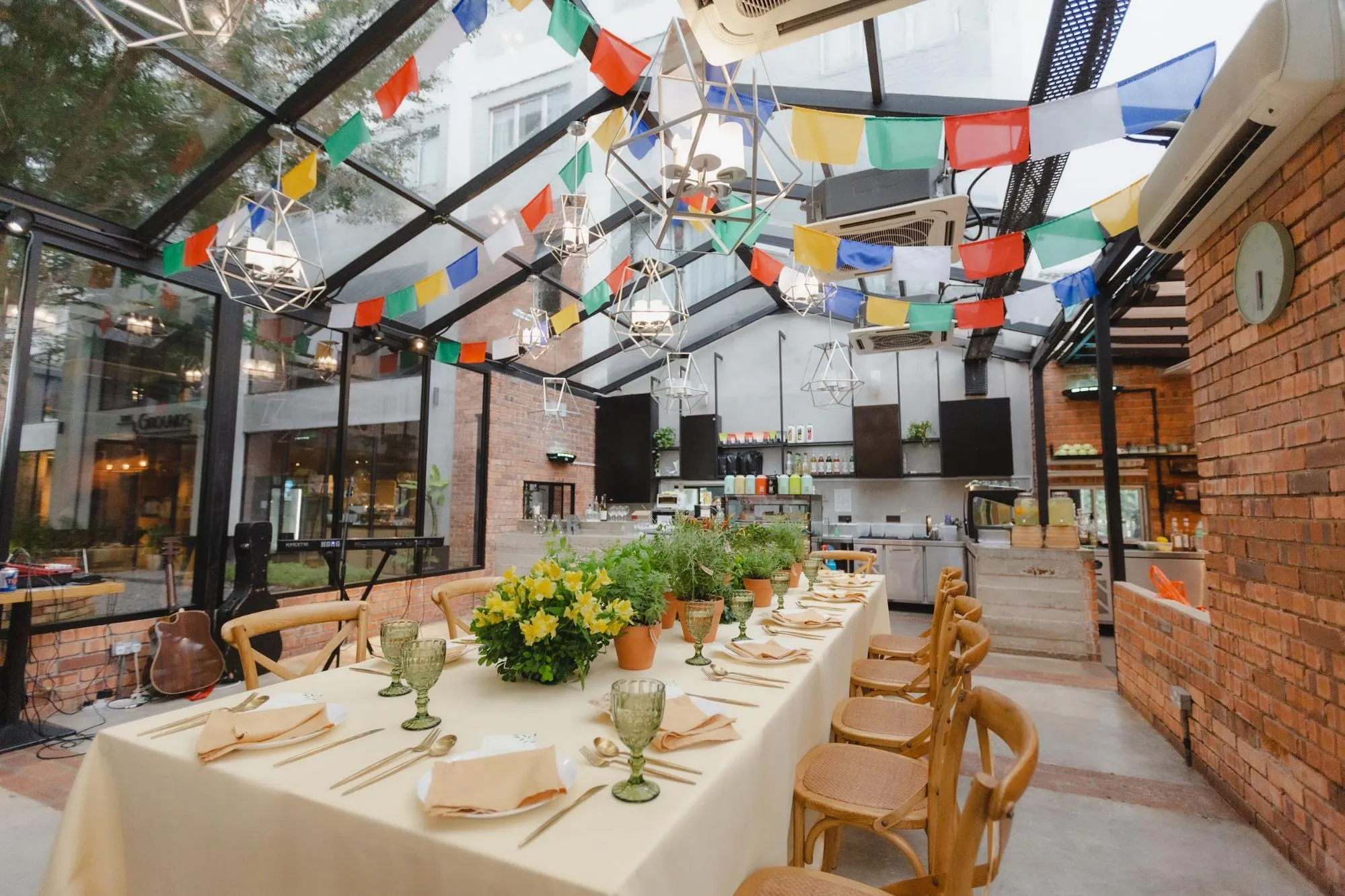 A celebrant told their love story and thereafter Clare and Prabin exchanged their vows in a cosy nook adjacent to the glasshouse surrounded by yellow and green floral arrangements. The reception was held in the glasshouse where the setting was organic. Herbs pots served as centrepieces that also doubled up as favours for their guests. After dinner, guests were treated to the games from their childhood and the night ended with guests dancing to a two person live band.