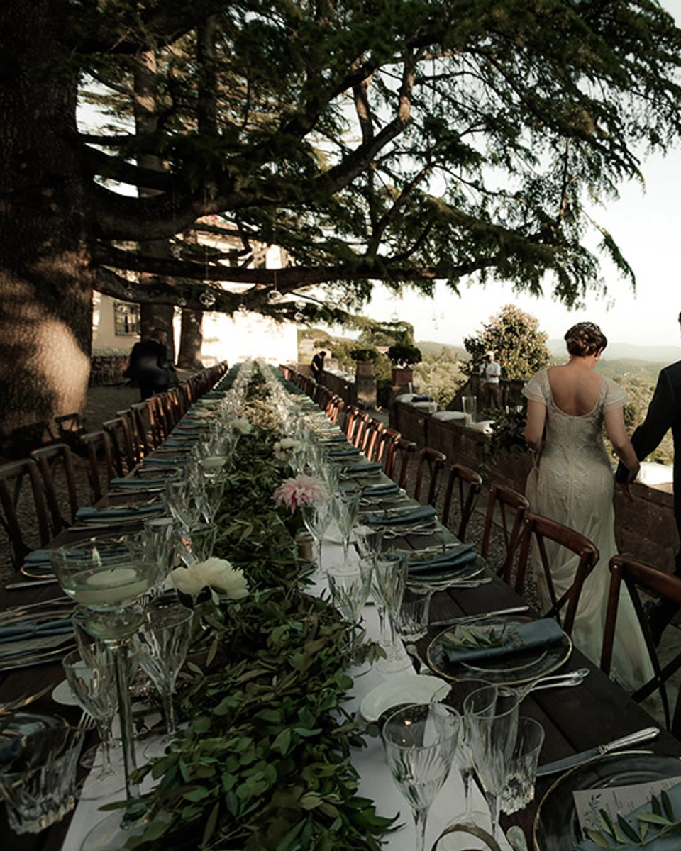 Photography by MangoRed / Videography by Jetmo Films / Venue Fattoria di Cinciano, Tuscany, Italy / Number of Guests 200 / Wedding Planning by Happening by Mascia Scardigli / Bridal Gown by Temperley London / Bride’s Shoes by Badgley Mischka / Hair and Makeup by Adrienne Aereboe / Groom’s Attire Custom made in Milan / Wedding Bands Custom made in Dubai / Bridesmaids’ Attire by Coast (skirts) and Bridesmaids’ own (blouses) / Groomsmen’s Attire Custom made / Flowers and Décor by Happening by Mascia Scardigli / Wedding Catering by Tuscan Excelsia / Wedding Cake and Dessert by Tuscan Excelsia / Art and Stationery by Peggy and Kate Illustration and Stationery / Wedding Entertainment by Chiara Trallori