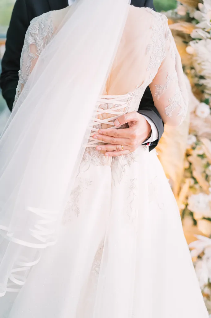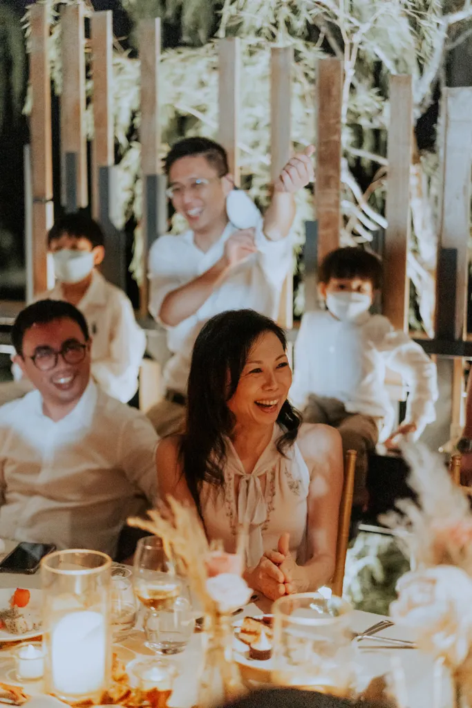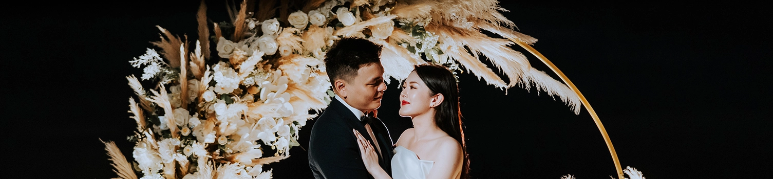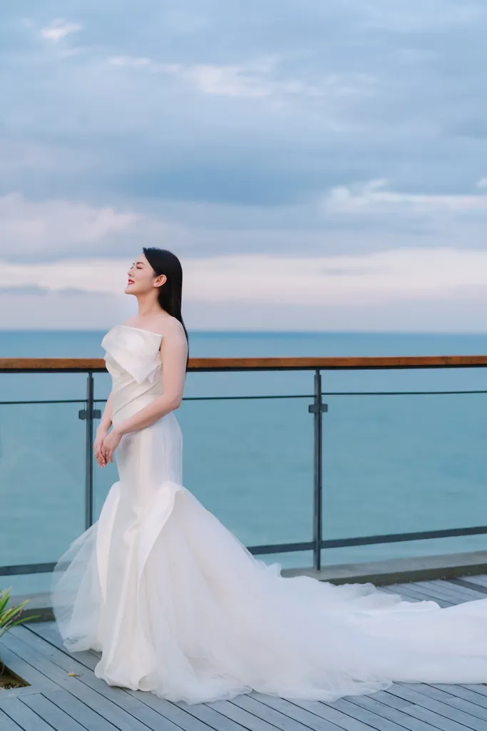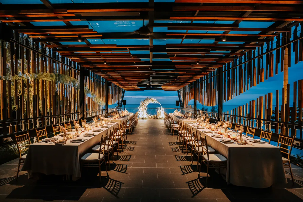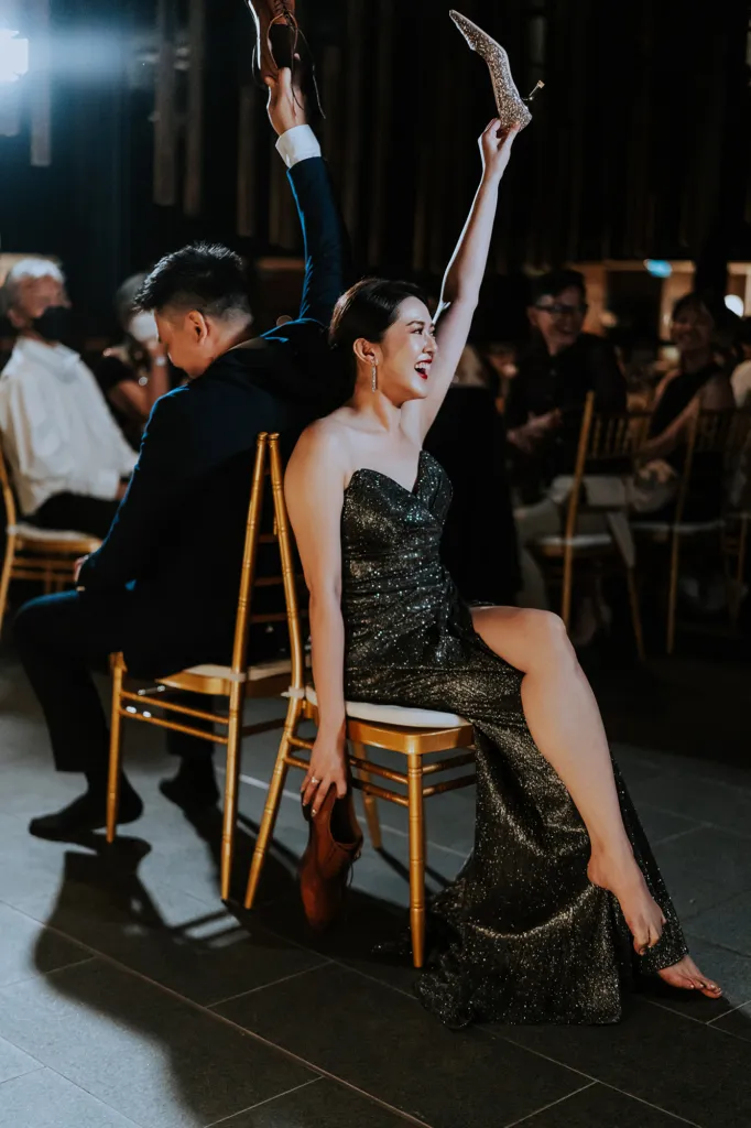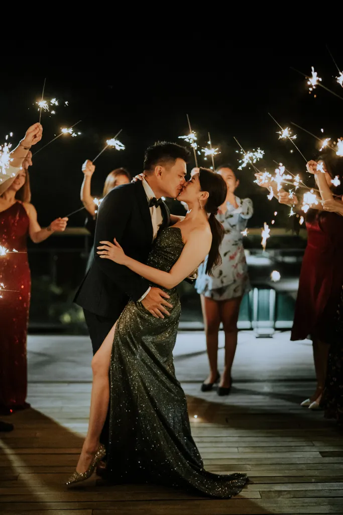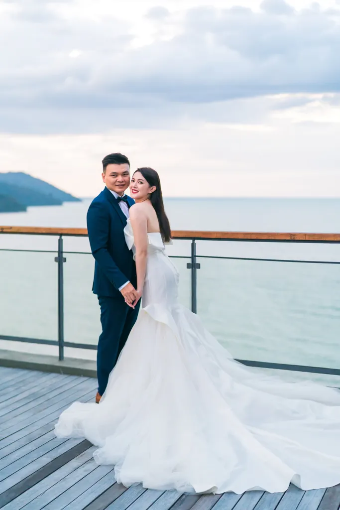“You probably can’t tell from the photos but the sky was really gloomy that day. we took a chance and went ahead with plan A, which is to have our reception on the deck. Although the area was covered, it would still have left our guest expose to some rain as it was a very windy location.” recalled Cheri. Such are the challenges of throwing a party outdoors in Malaysia. Thankfully it did not rain and as the sun set on the horizon, the deck lit up gloriously, doubling up as reception area. Cheri’s second look was a stand-out structural sleeveless satin mermaid gown with modern silhouette. She ended the night in a stunning full length dark sequinned gown with a high slit and matching stilettos. The couple were extremely pleased with the professionalism and hospitality of the staff at Angsana Teluk Bahang and had only high praises for the entire crew. Especially mentioned was the couple’s on-site wedding co-ordinator -Eva, who helped pulled off this event within 3 weeks.