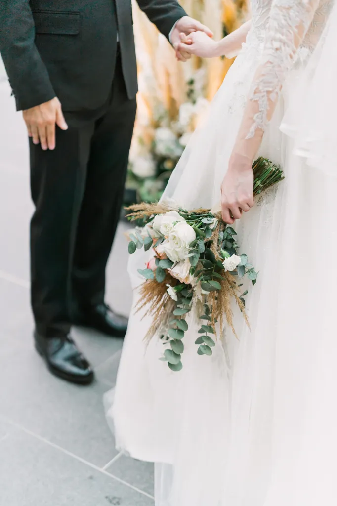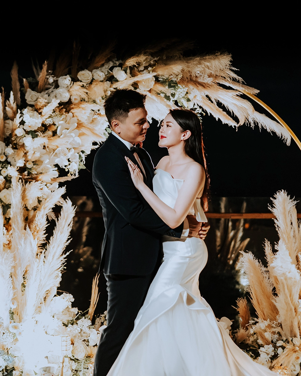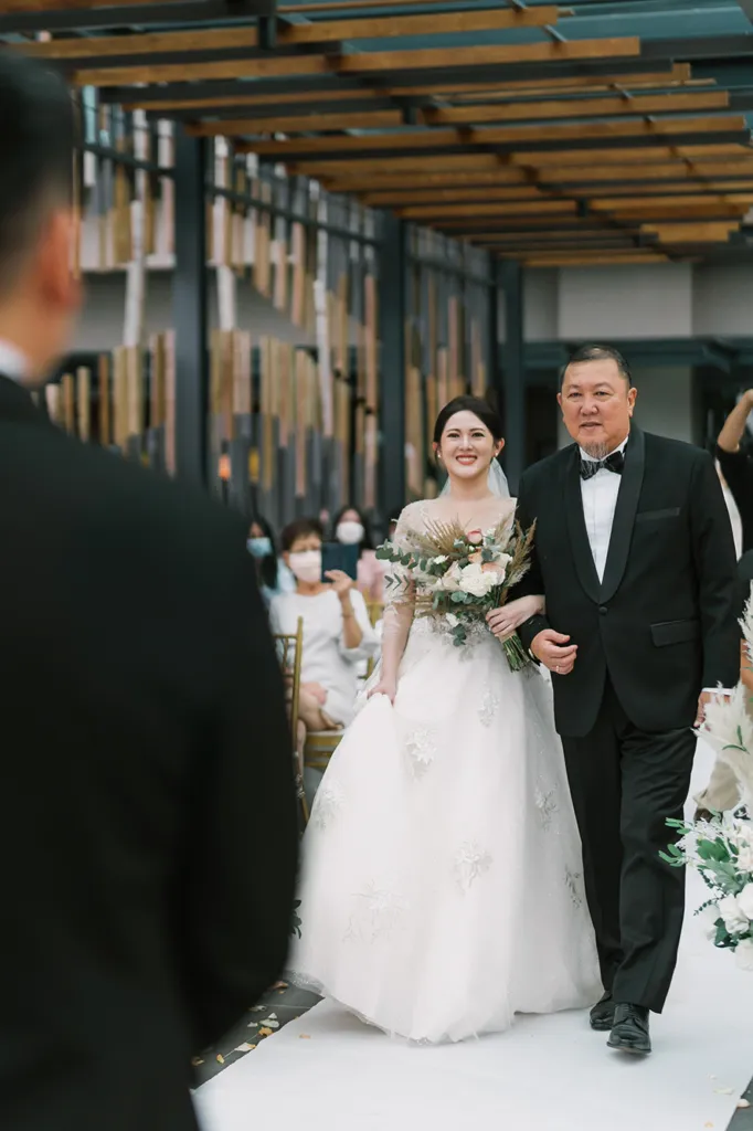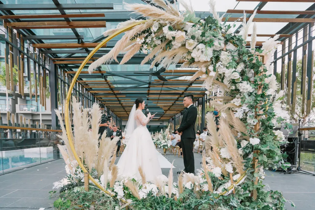 The bride wore a classic A line gown with lace bodice for the evening ceremony. A circular arch was set up at the alter which supported the crescent-shaped floral arrangement of roses and pampas grass. Similar flowers in gold vintage vases lined both sides of the aisle as Cheri walked down the aisle with her father by her side. 65 guests were in attendance and all made the trip to Penang from KL at short notice to support the newlyweds.
