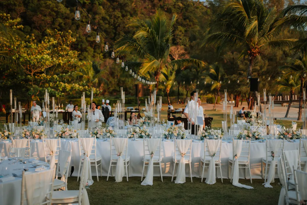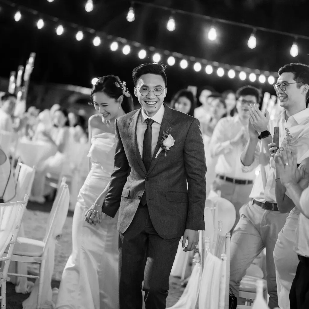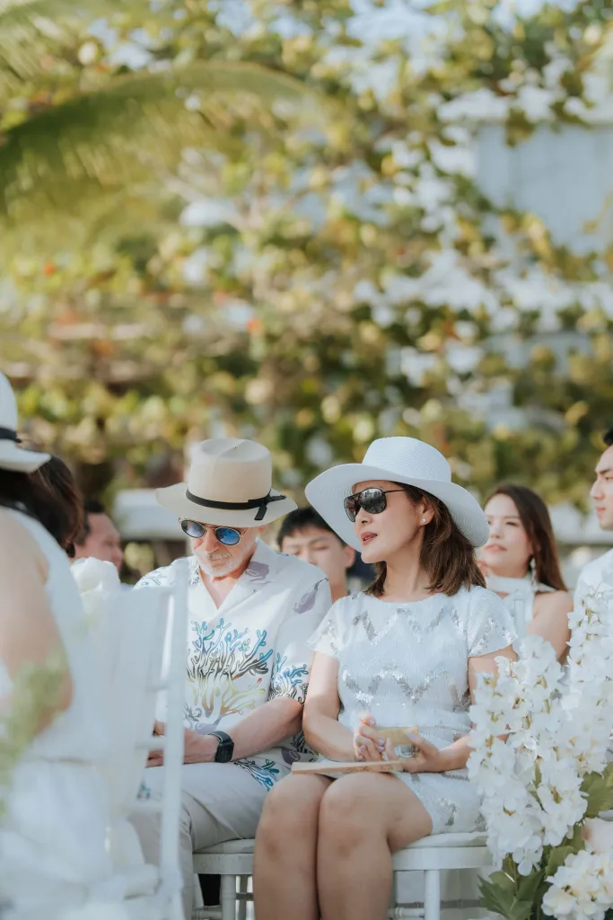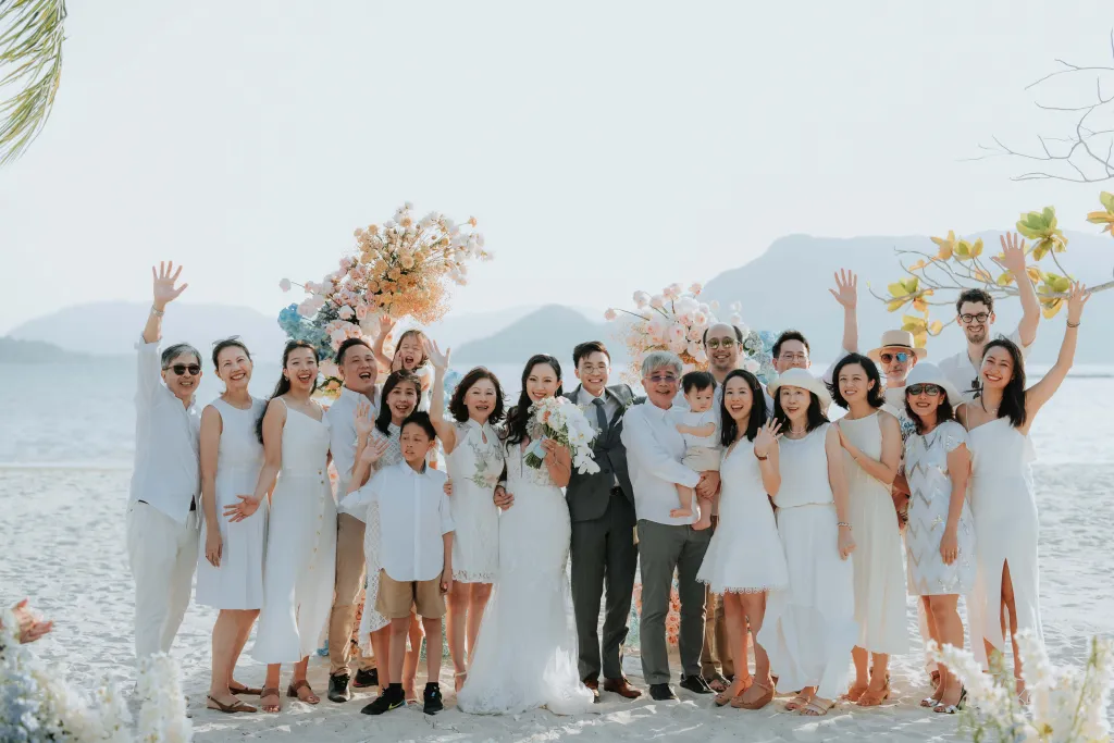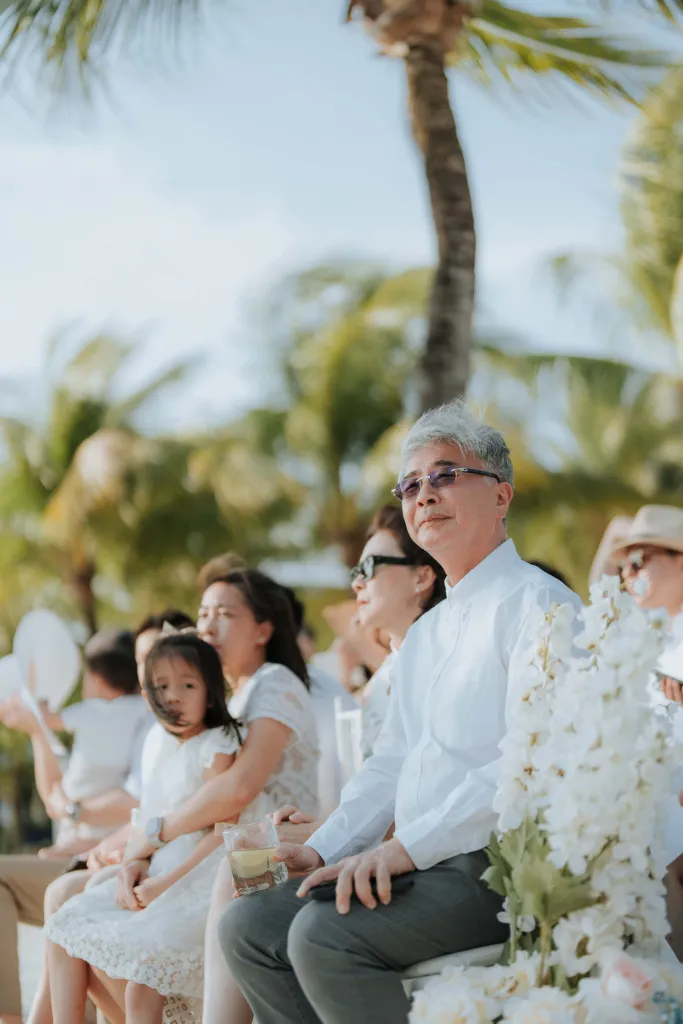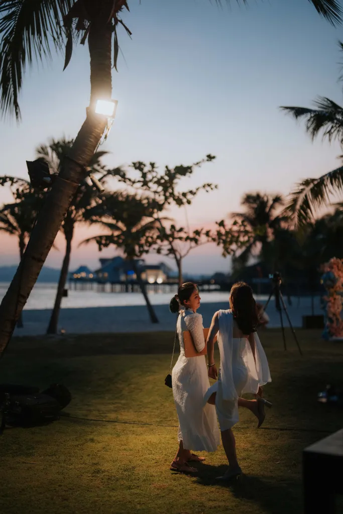 The theme for the day was “resort elegance in white,” a choice that added a touch of sophistication to the beachside ceremony. The day’s events were well planned out: from the morning gate crashing games to the evening vow ceremony and exchange of vows, and finally, the night-time reception dinner. The entire wedding was cherished by the couple as an intimate moment shared with close friends and family. Blessed with beautiful weather, one moment that truly stood out for them was the stunning sunset that cast a romantic glow during their vow ceremony.