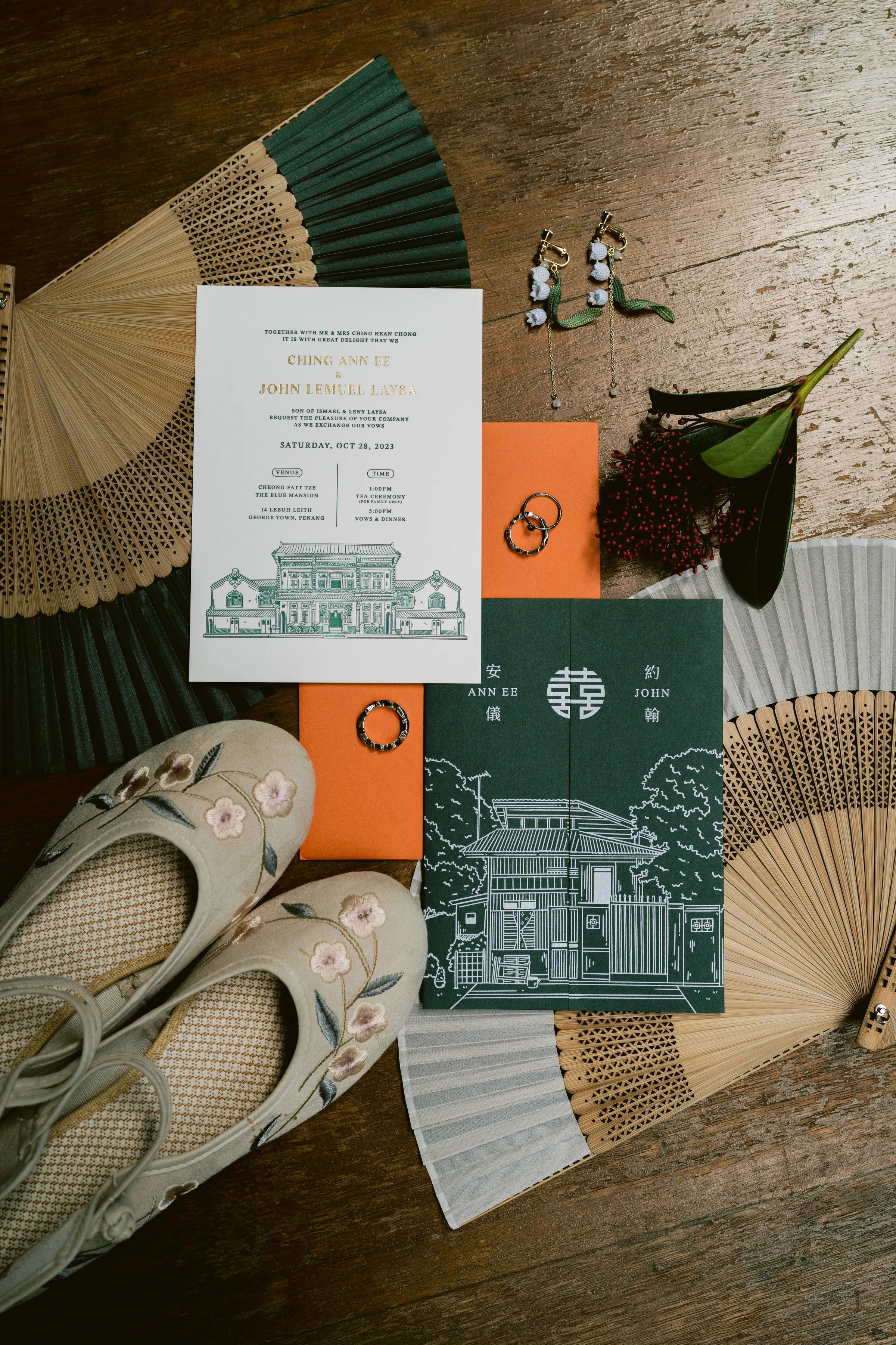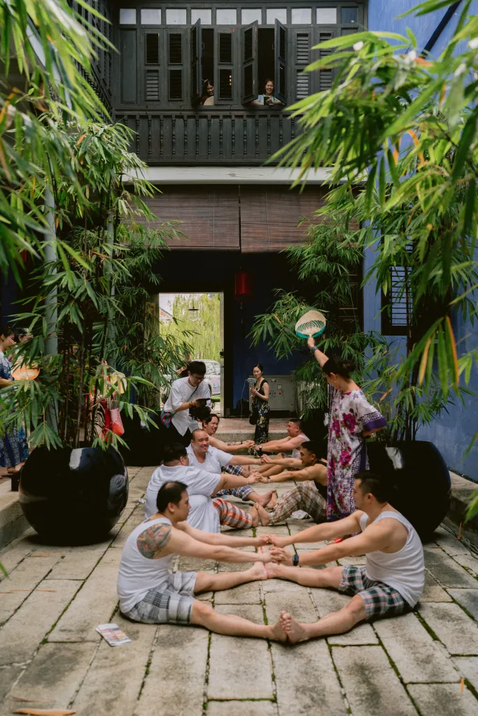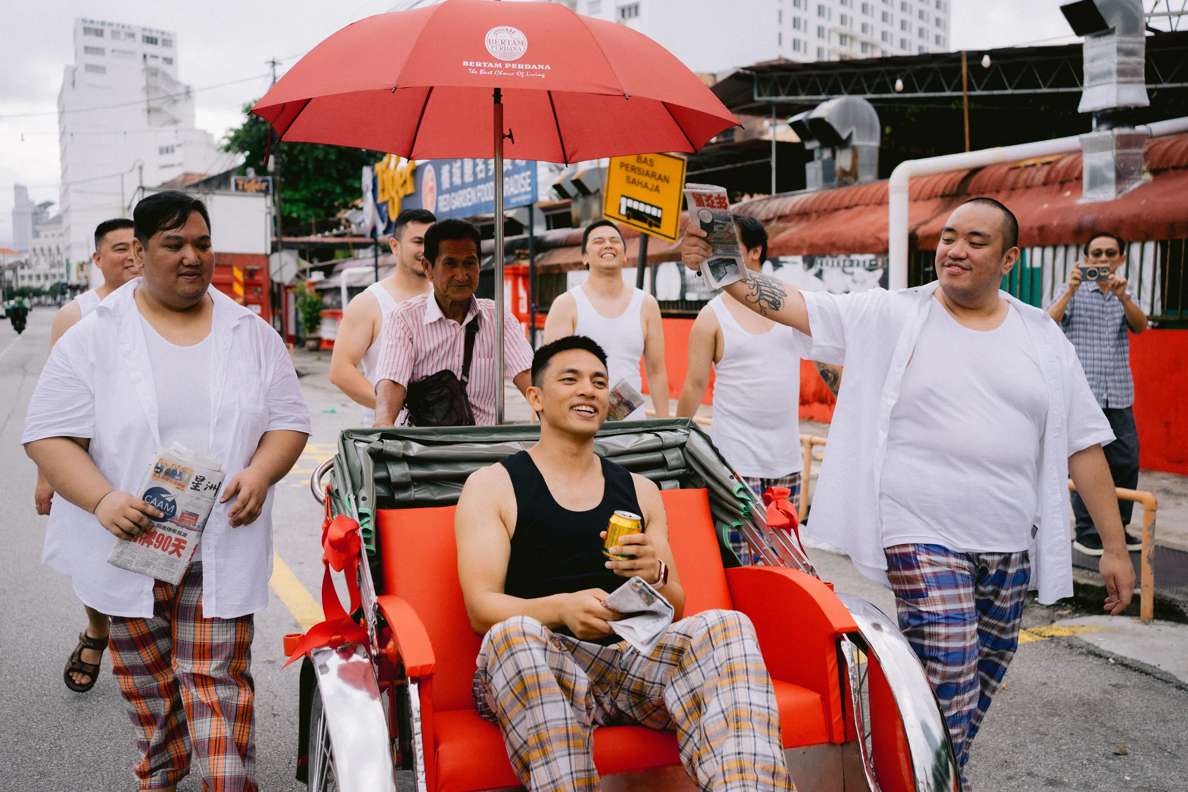 The festivities kicked off with an entertaining gatecrashing ritual—a tradition that found a unique twist in the hands of the bride and groom. JL and his groomsmen, outfitted in quintessentially Malaysian singlets and sarong, mirrored the image of a local satay pakcik, creating a humorous sight as they paraded from The Edison to The Blue Mansion. In contrast, Ann Ee and her entourage donned kaftans and hair rollers, embodying the essence of the makcik next door. This lively event, marked by challenges and playful antics, was a cultural nod to the Malaysian community spirit and a joyous start to the day’s proceedings.