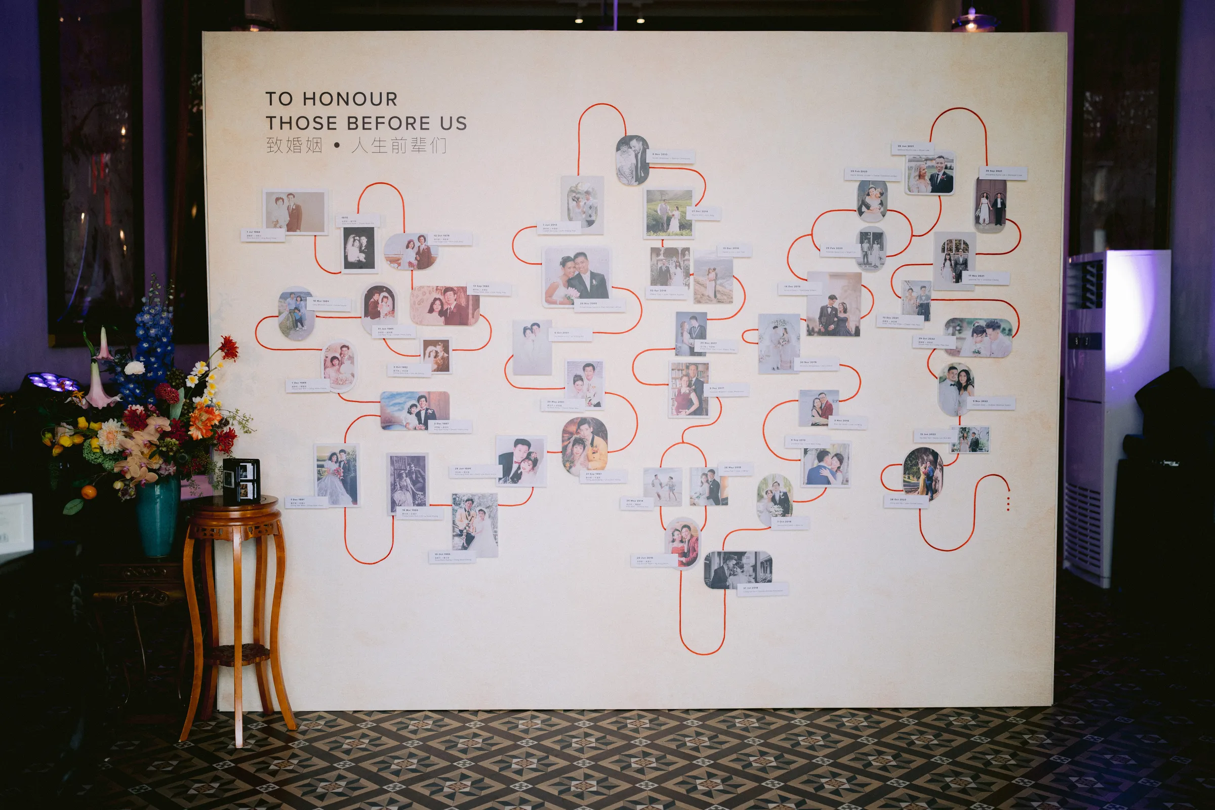 A particularly touching aspect of their wedding was the ‘honouring of married guests’. Before the day, the couple embarked on a secret project to collect wedding dates and photos from their already married guests. They then crafted a chronological timeline adorned with these memories, all connected by a red thread representing the fate that had woven their lives together. This heartfelt tribute was a testament to the journeys that preceded theirs and the bonds that would continue to grow.