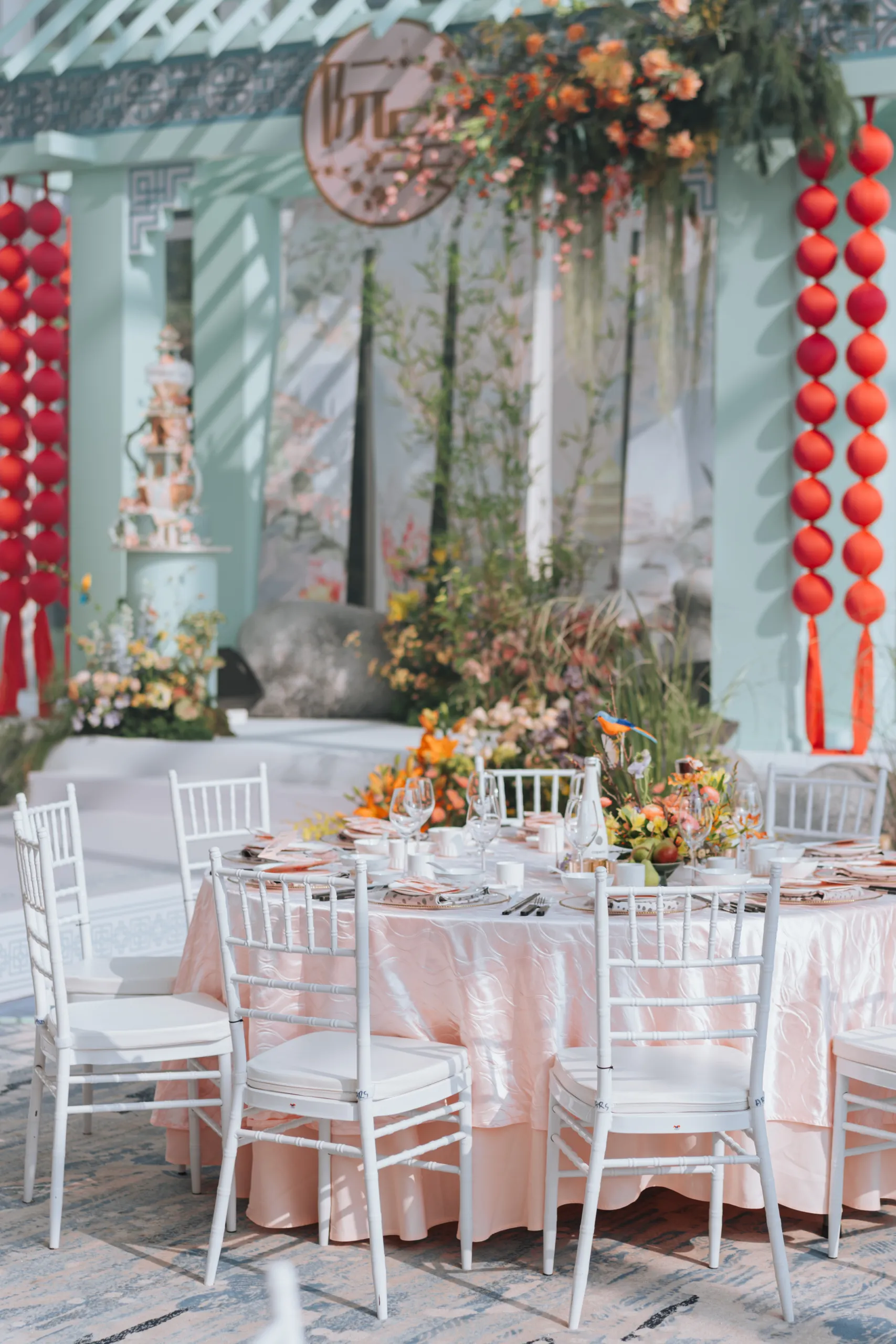 The wedding’s decor featured soft pastel palette enhanced by vibrant red and floral accents. The use of mint green as a primary colour throughout the venue created a serene and contemporary atmosphere, while the pops of bold red brought in elements of Chinese tradition, symbolising luck and prosperity.