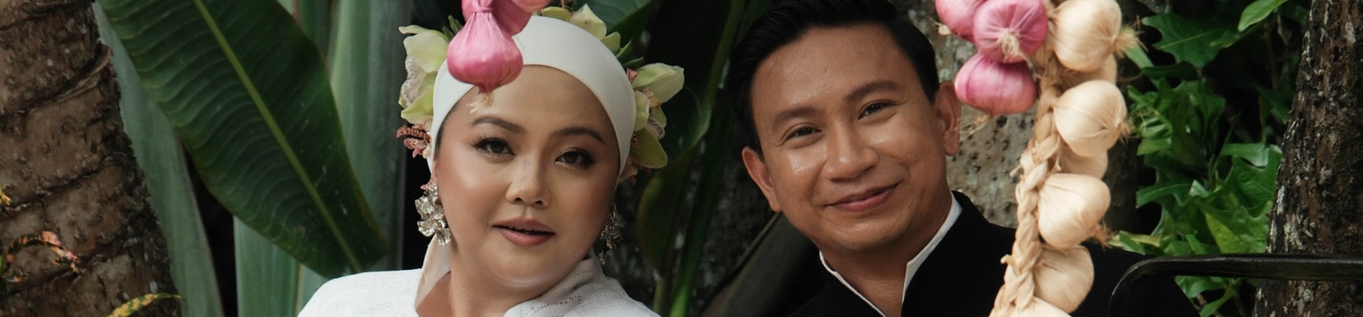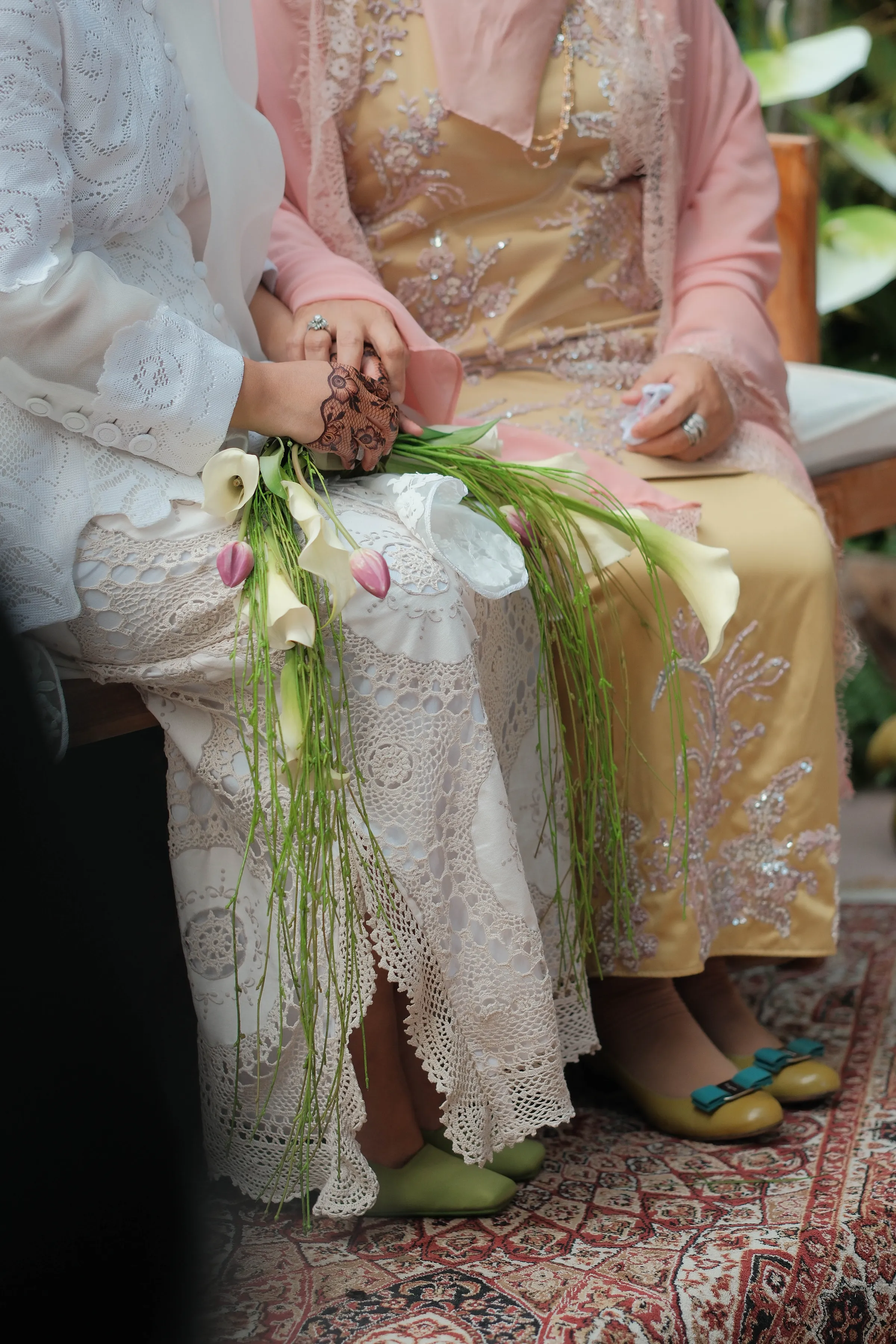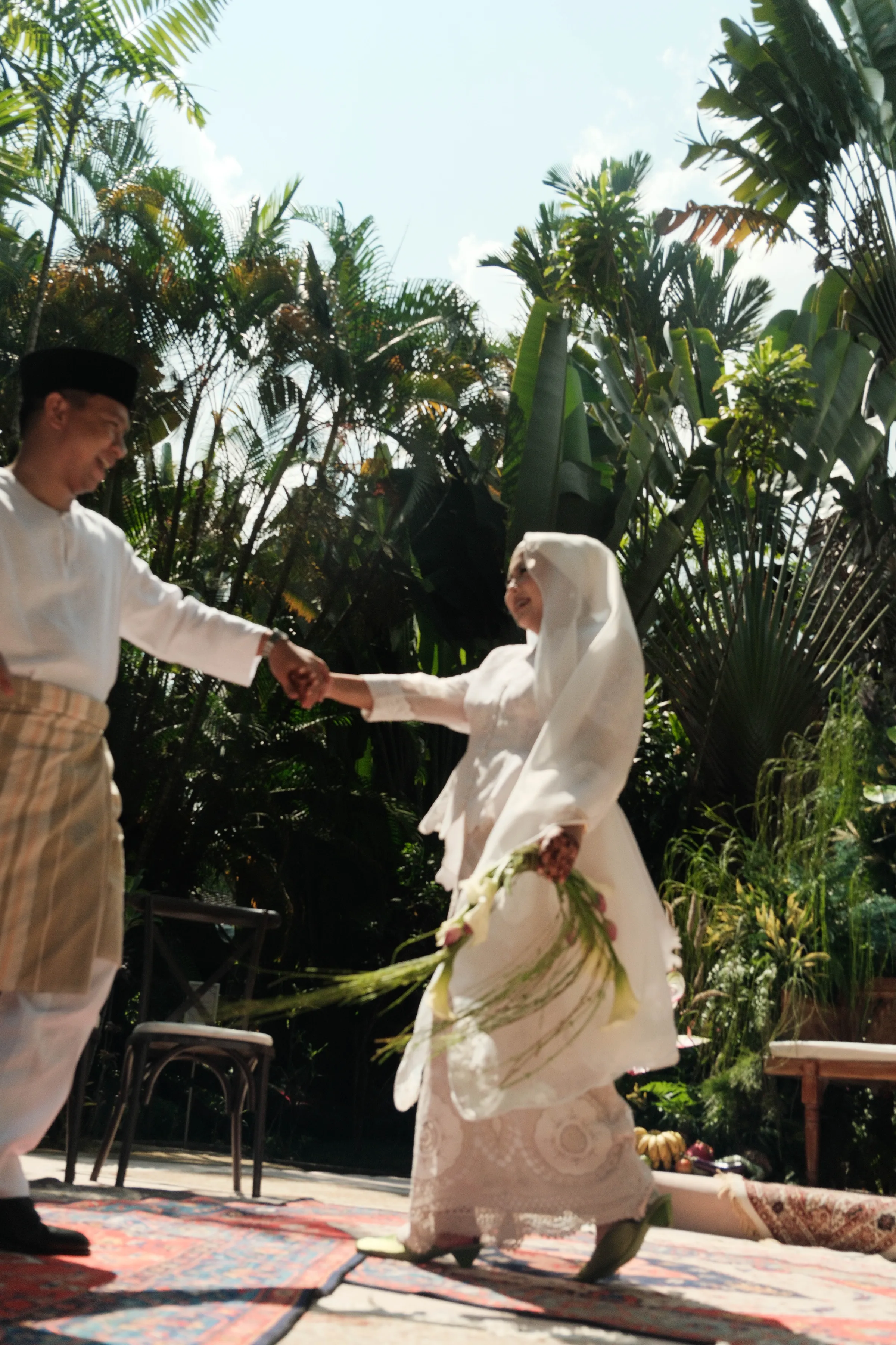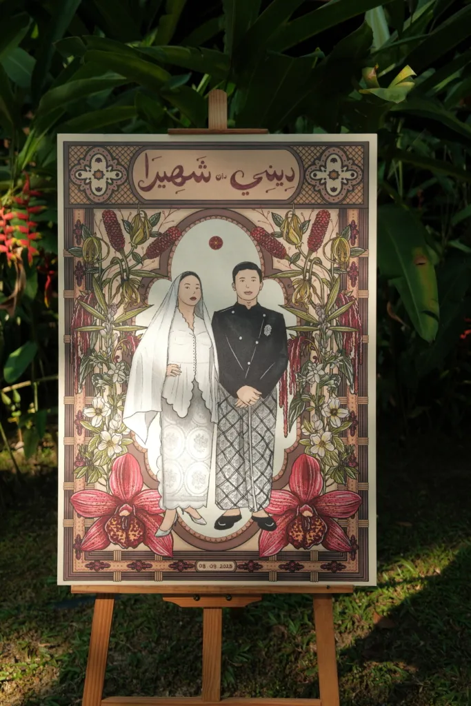 In a setting that echoed old-world elegance, the couple chose to express their shared narrative through elements deeply rooted in heritage. The bride wore a bespoke kebaya by Toton, crafted from repurposed lace, fusing sustainability with artisanal craft. Her look was completed with a flower crown of tropical blooms and a striking bouquet made from jantung pisang and petai — an unexpected yet symbolic arrangement drawn from the earth. The groom wore a Kraton beskap suit, layered over a custom baju melayu by Omar Ali, discreetly embroidered with his vows — a poetic and notably powerful detail.