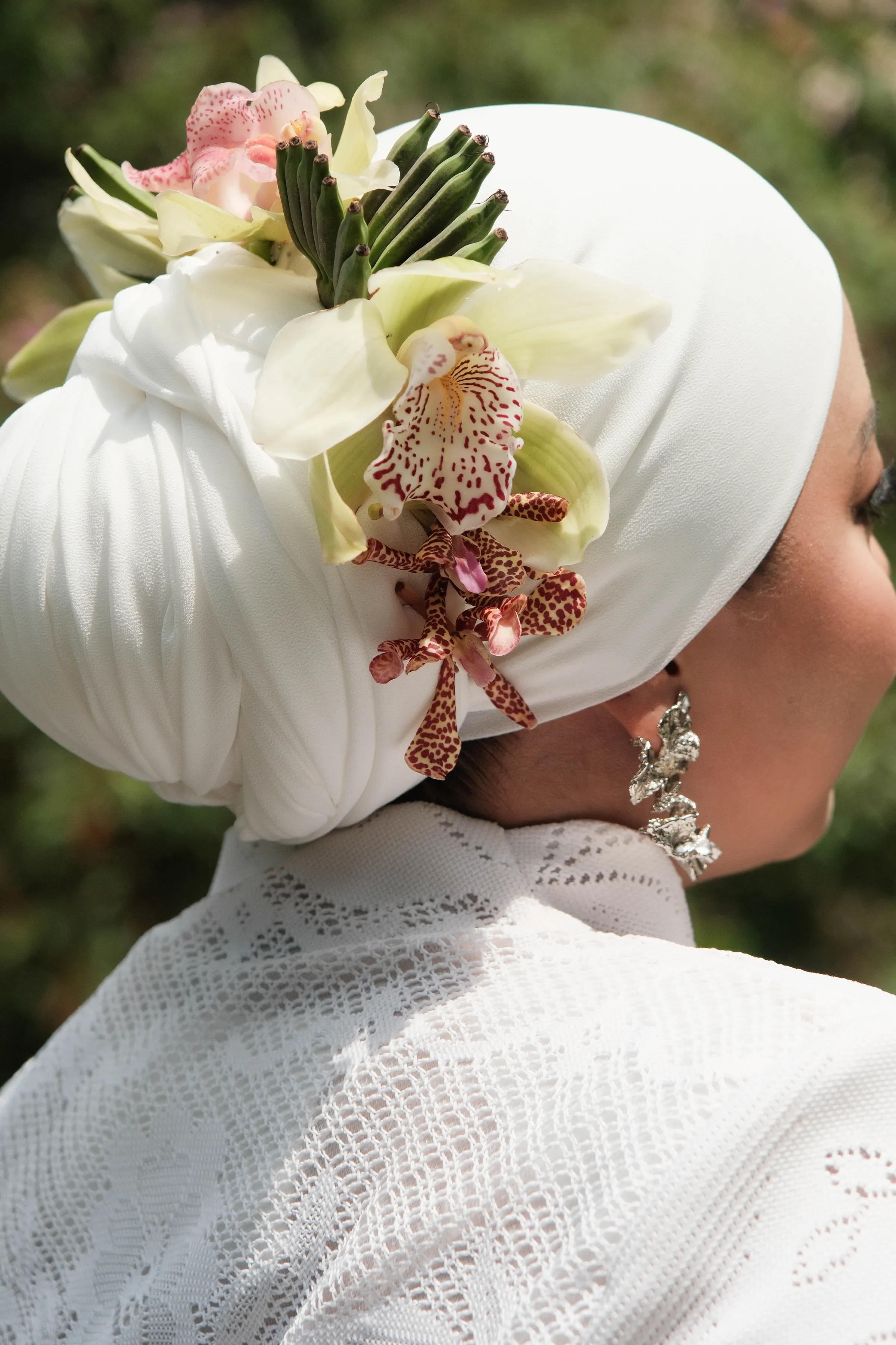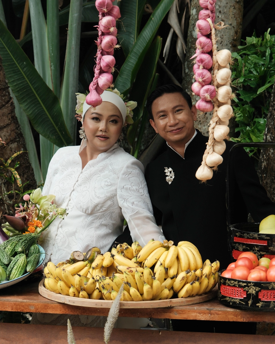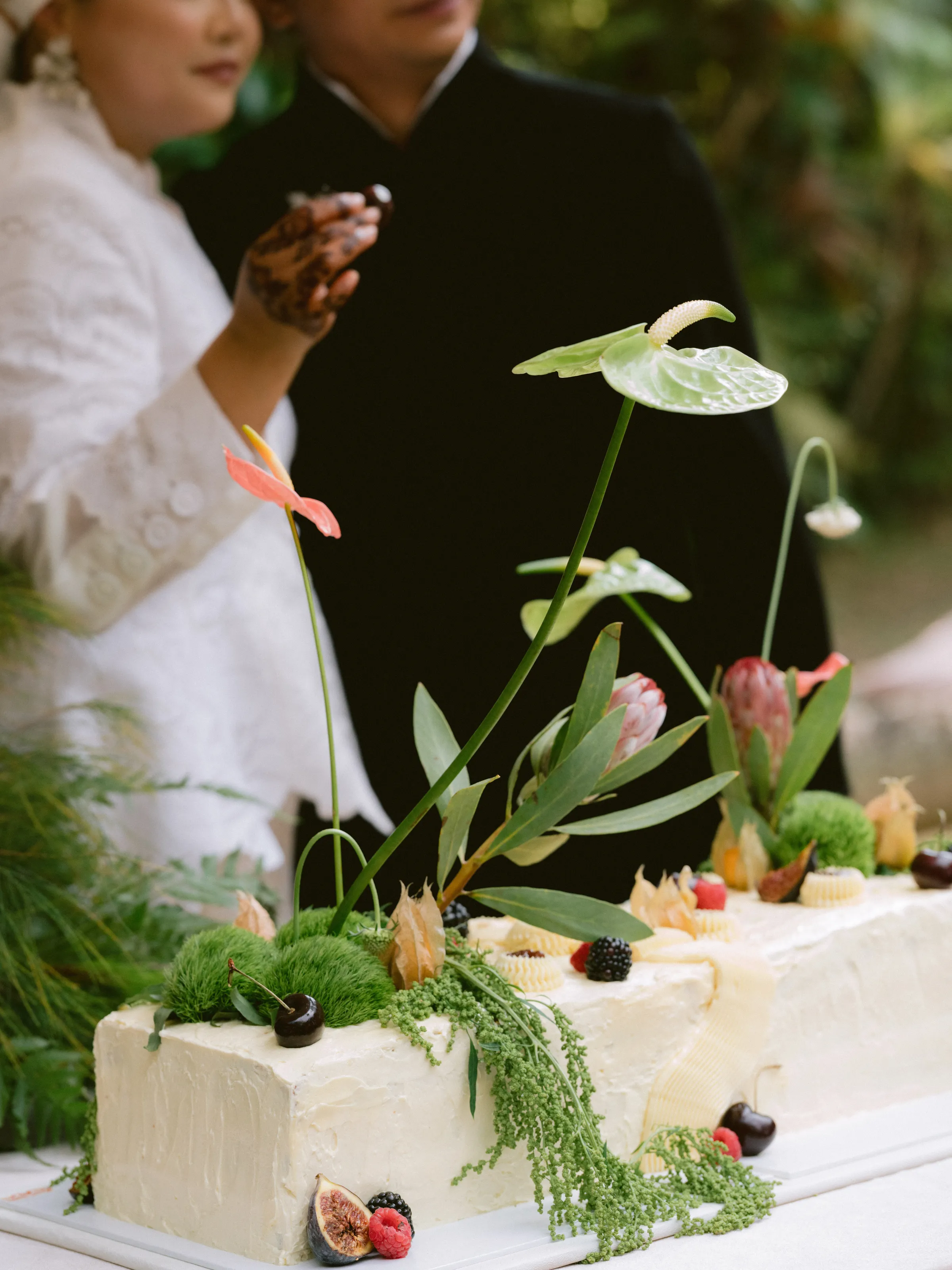 In a setting that echoed old-world elegance, the couple chose to express their shared narrative through elements deeply rooted in heritage. The bride wore a bespoke kebaya by Toton, crafted from repurposed lace, fusing sustainability with artisanal craft. Her look was completed with a flower crown of tropical blooms and a striking bouquet made from jantung pisang and petai — an unexpected yet symbolic arrangement drawn from the earth. The groom wore a Kraton beskap suit, layered over a custom baju melayu by Omar Ali, discreetly embroidered with his vows — a poetic and notably powerful detail.