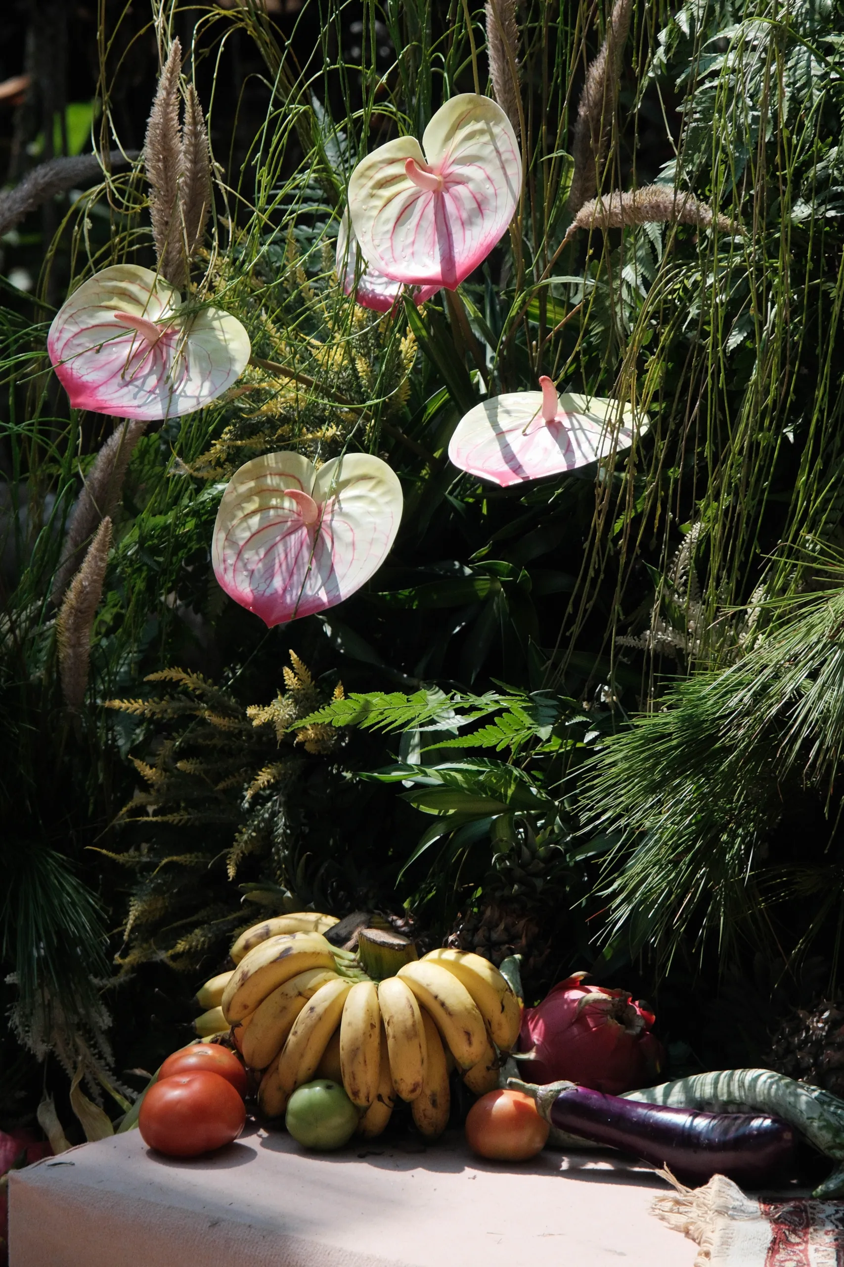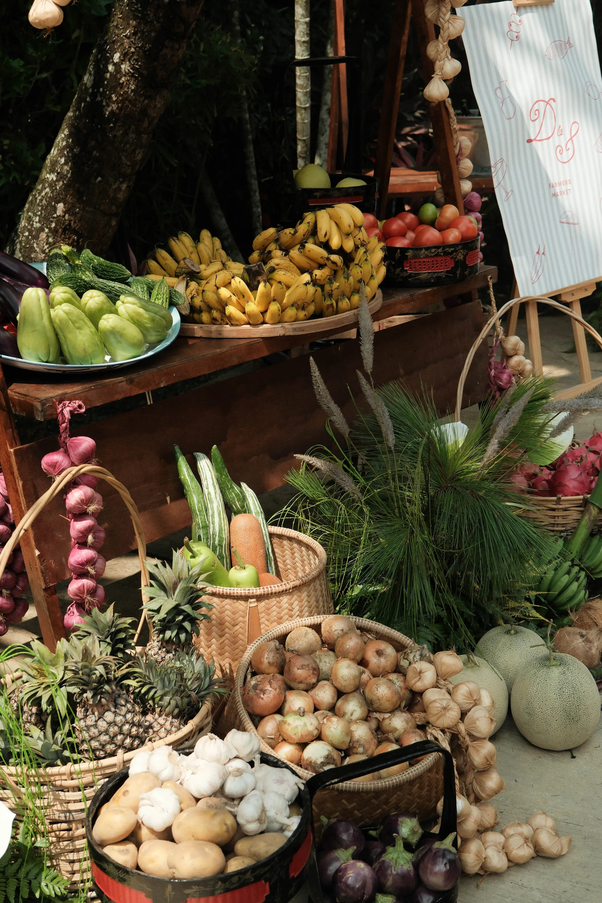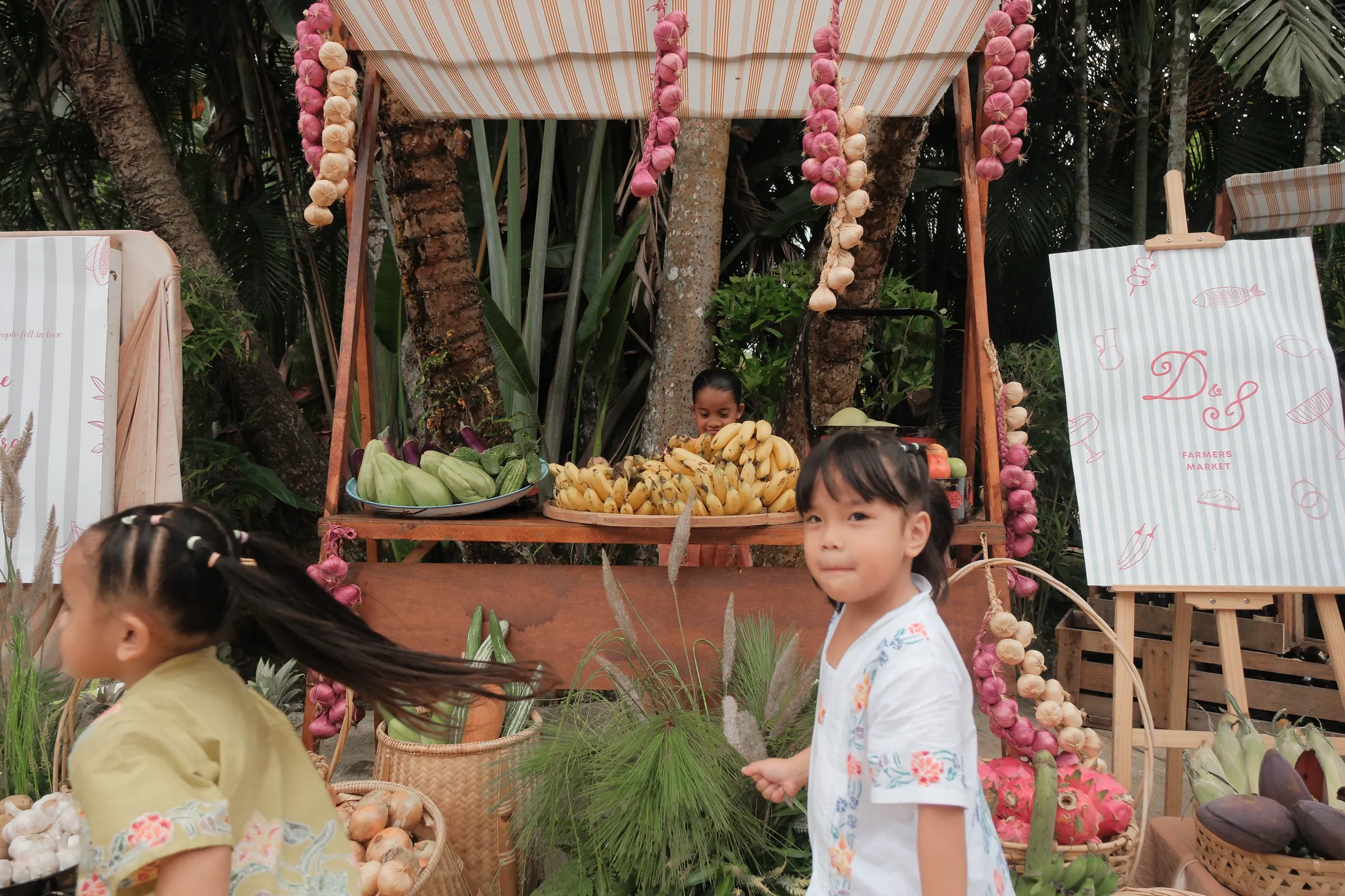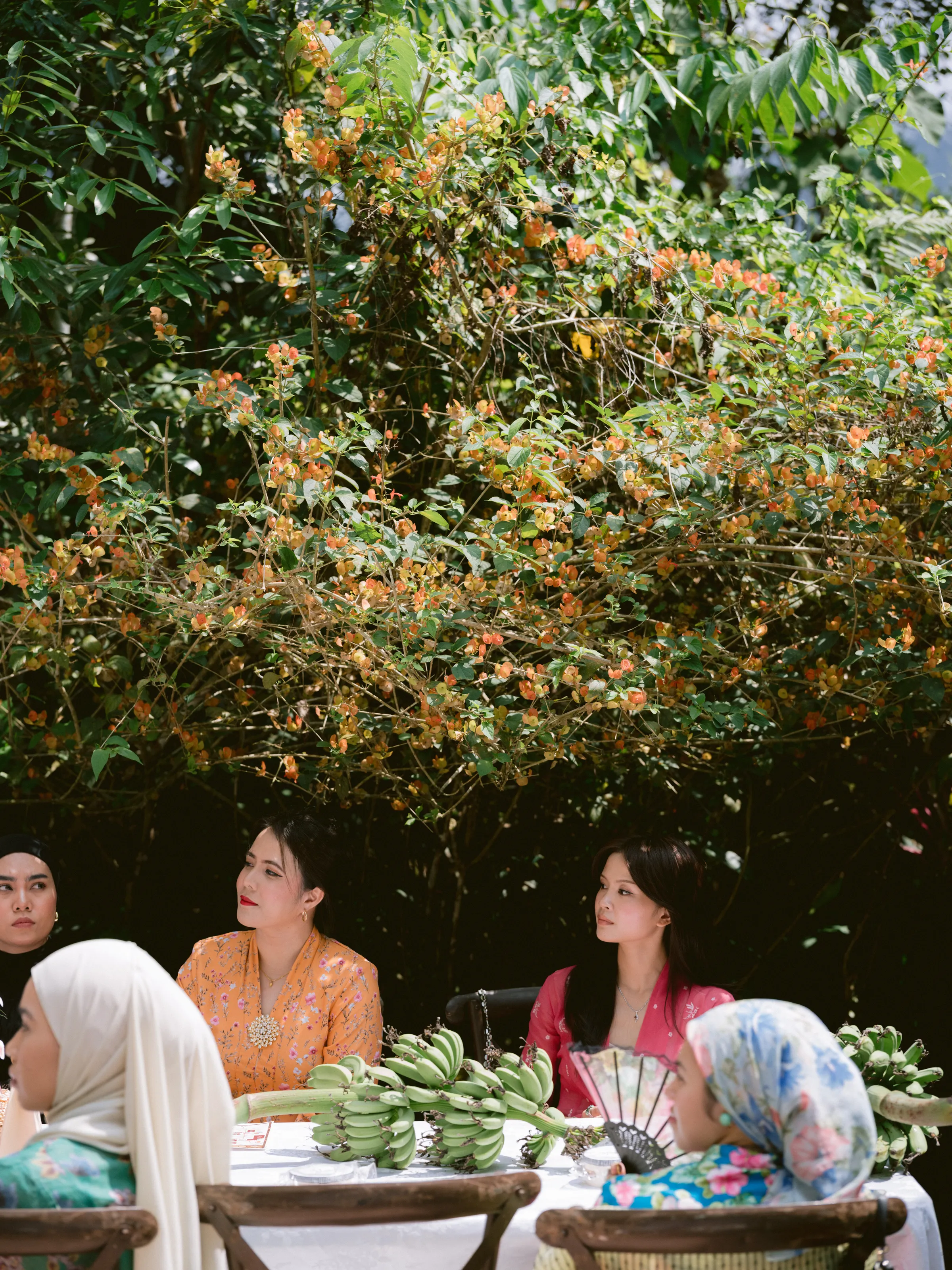 Guests were treated to a kampung-style feast, served beneath dappled sunlight. Tables were draped in earth-toned linens and adorned with tropical fruits and fresh produce from D&S Farmers Market. These fruits and vegetables doubled as both centrepieces and functional favours, with guests invited to fill their own bags to take home — a charming, sustainable gesture.