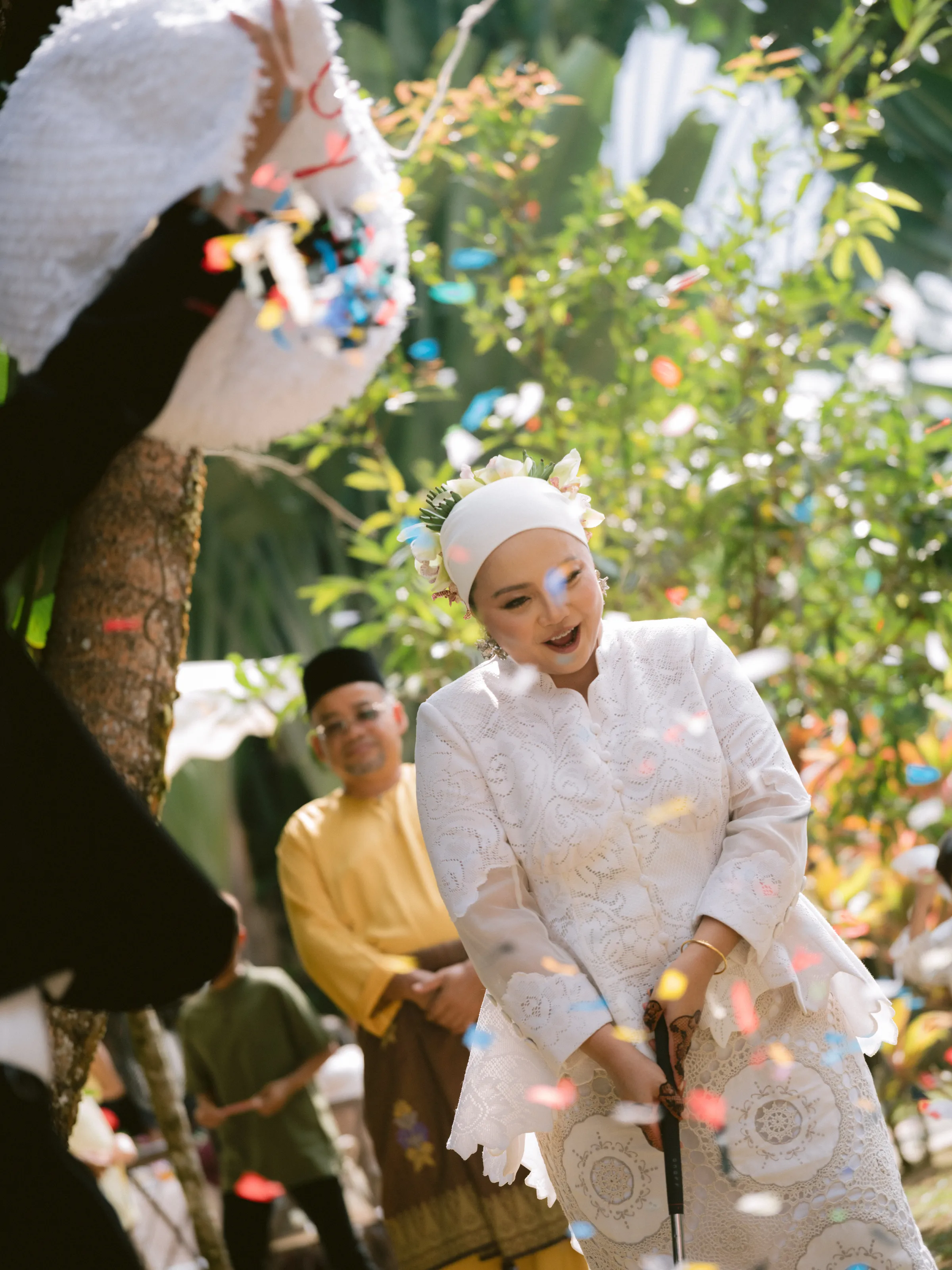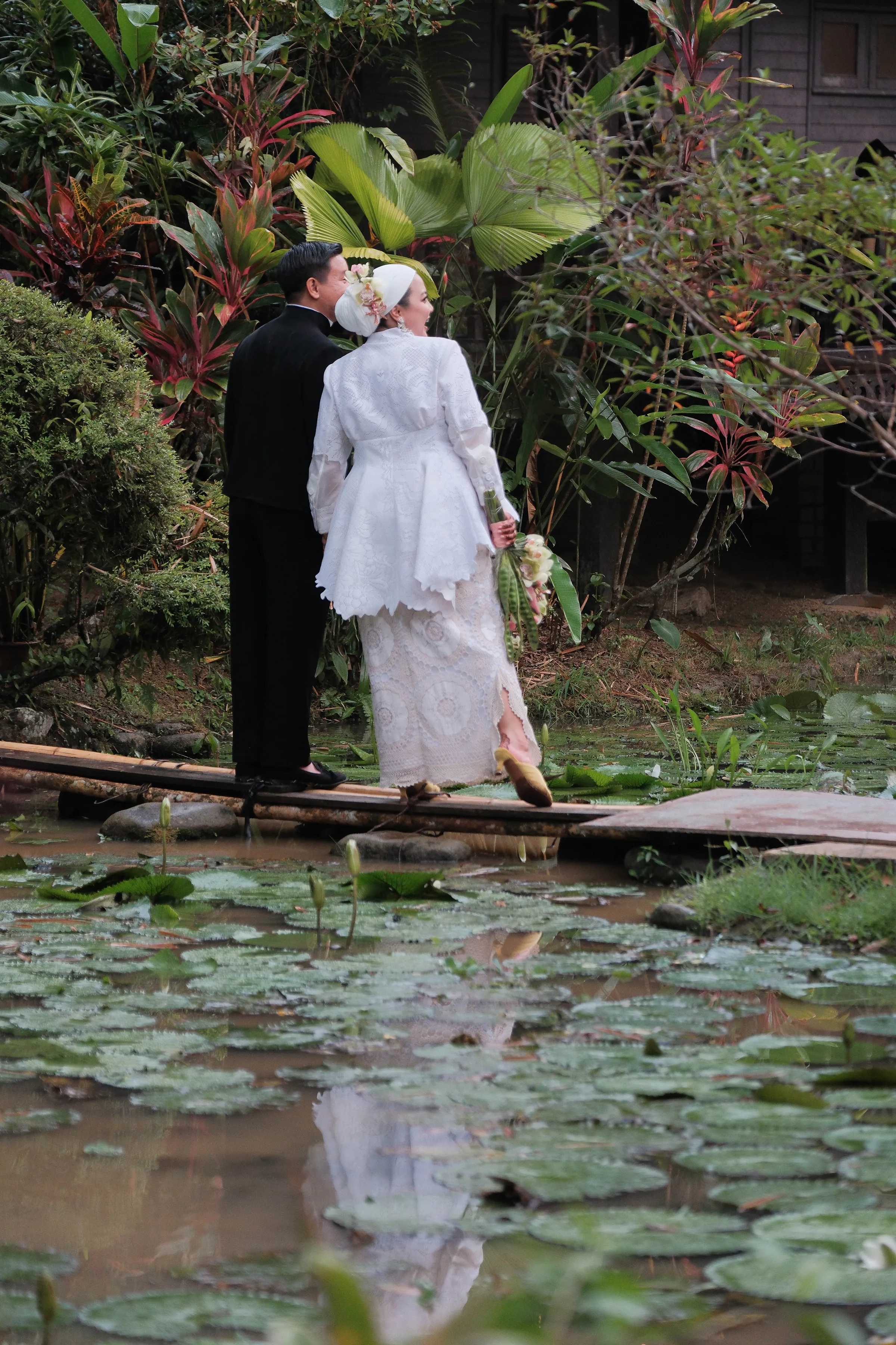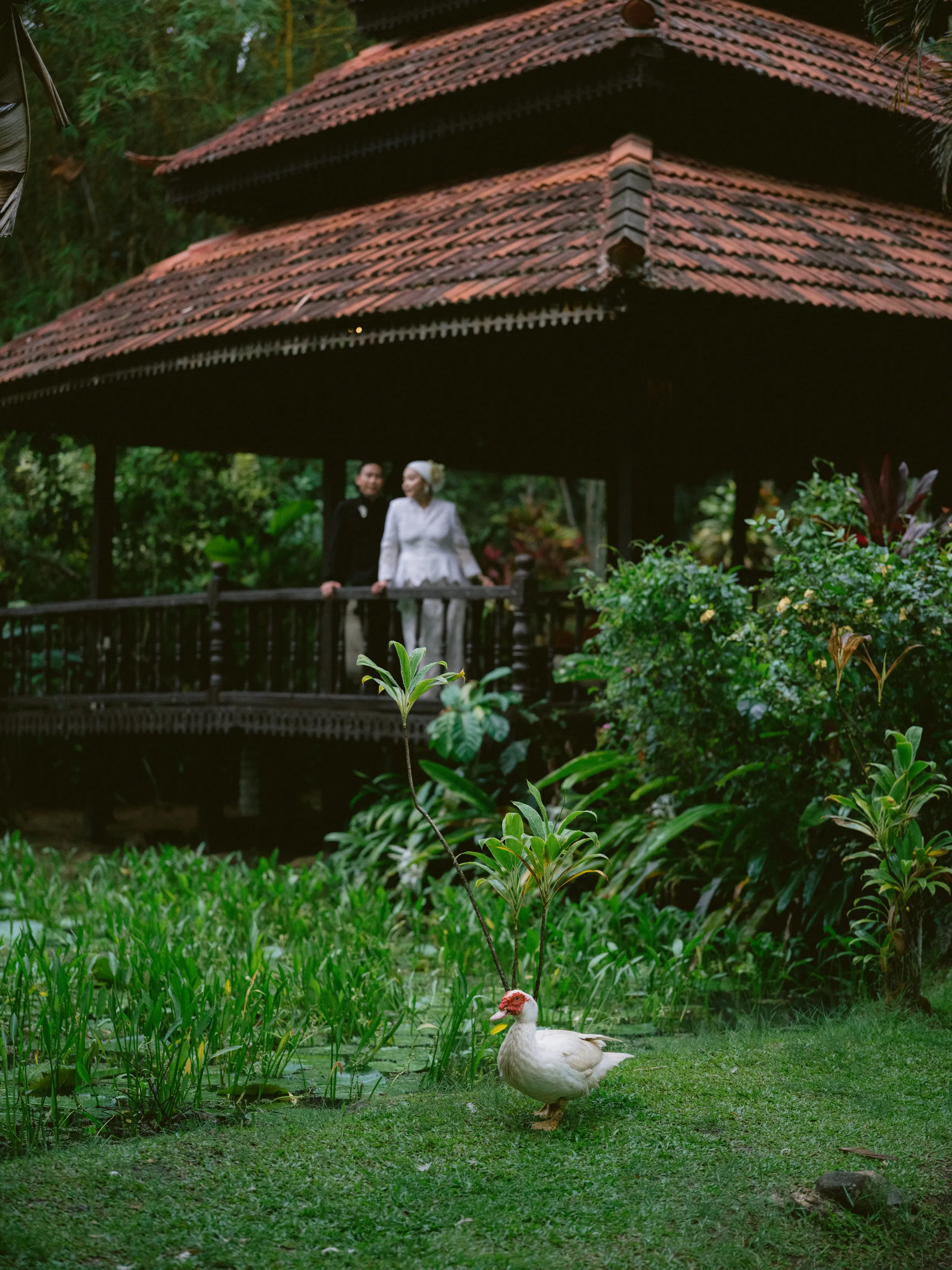 The aesthetic of the wedding drew unmistakable inspiration from both kampung life and royal heritage. Nature was both the canvas and the decor: lily-filled ponds, dense tropical flora, and wooden walkways created a setting that evoked the romance of a bygone era.